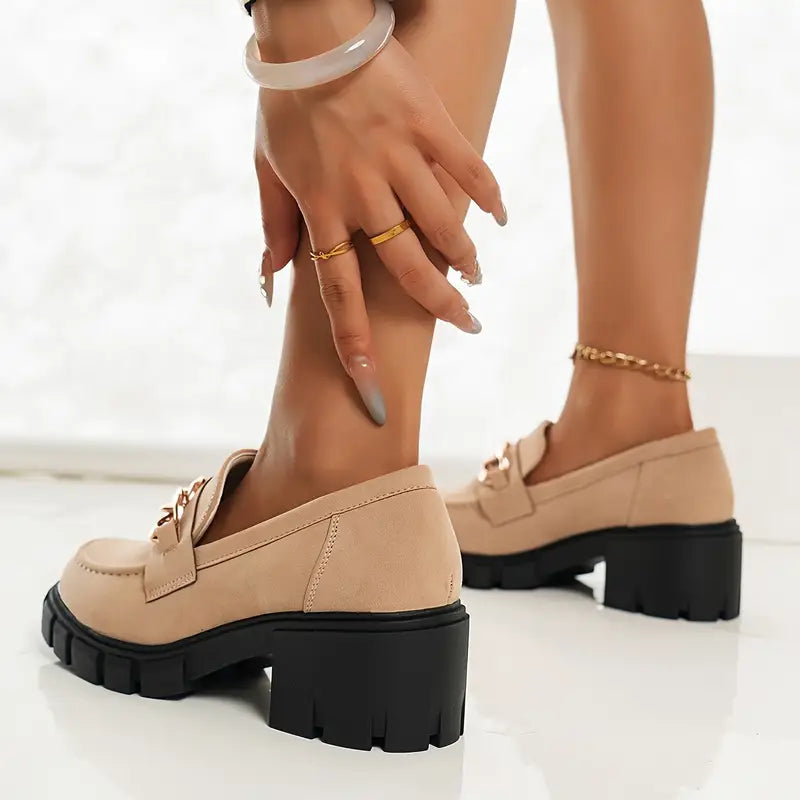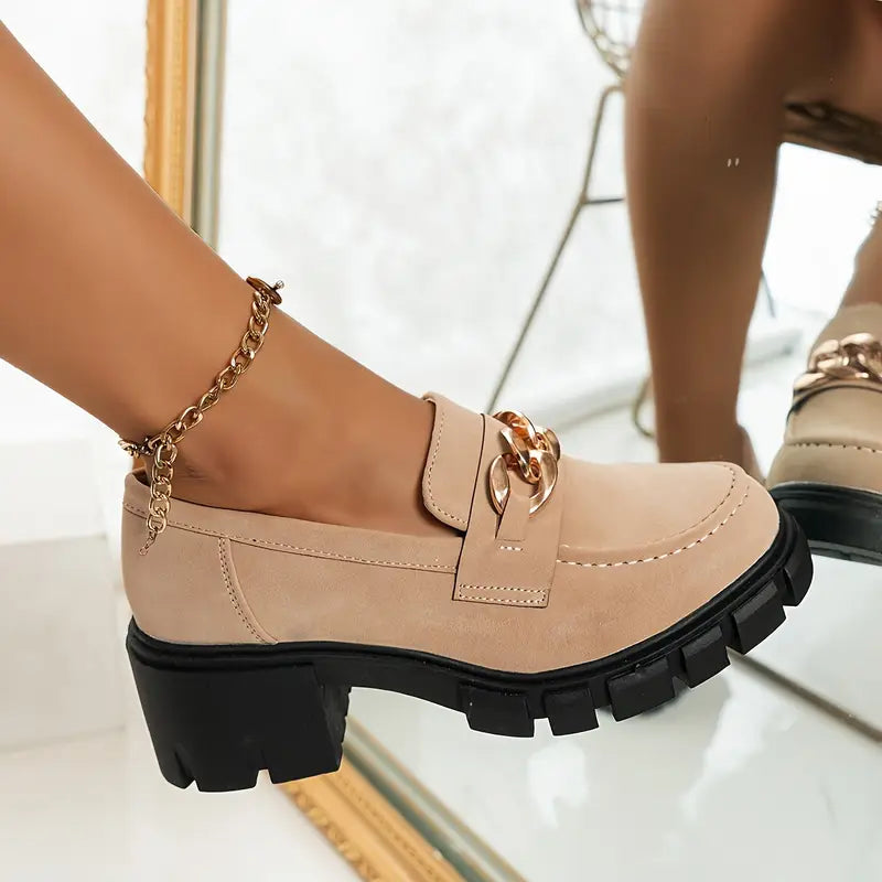 Kobiety metalowy łańcucha mokasyna złożone z blokową piętą