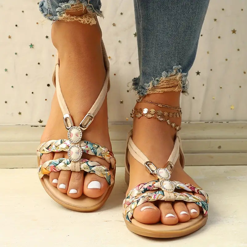 Odkryj nasze letnie sandały damskie na płaskiej podeszwie z dekoracją ze strasu, dostępne w kilku błyszczących kolorach. Wykonane z wysokiej jakości, trwałych materiałów, te sandały są idealne na ciepłe letnie miesiące. Ozdoba ze strasu dodaje odrobinę blasku i elegancji, dzięki czemu są eleganckim dodatkiem do Twojej letniej garderoby. Te płaskie sandały są idealne na wizyty na plaży, swobodne spacery lub wieczorne imprezy. Zapewniają zarówno wygodę, jak i styl. Ciesz się sezonem letnim z pewnością siebie i blaskiem w tych niezbędnych damskich płaskich sandałach z ozdobami ze strasu, zaprojektowanymi tak, aby zapewnić stopom chłód i styl przez całe lato.