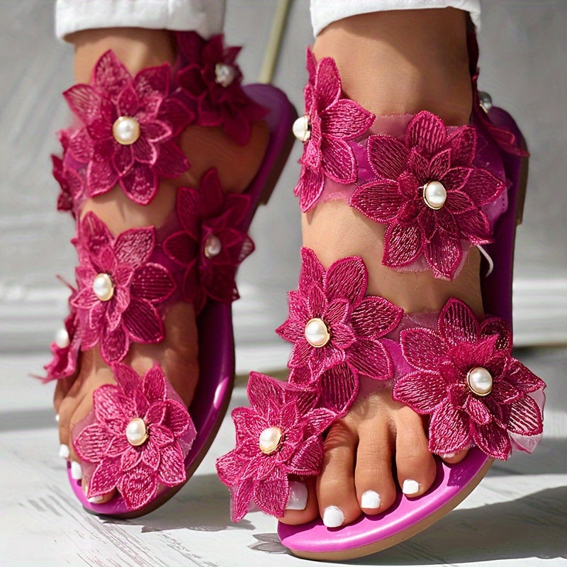 Damskie kwiatowe sandały na platformie, wsuwane z perełkami i paskiem na palcu