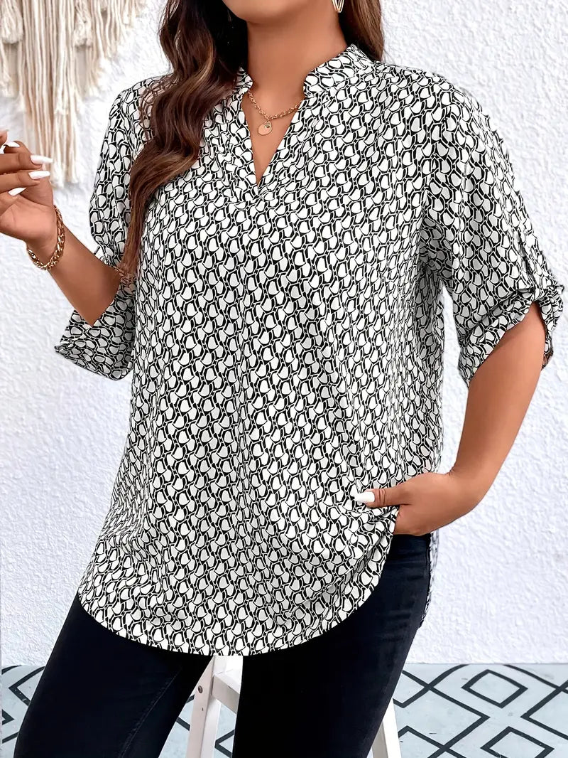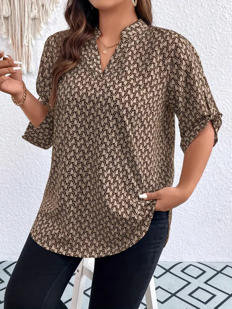 Przedstawiamy naszą niezwykle elegancką tunikę plus size z nadrukiem na całej powierzchni, podwiniętymi rękawami i wycięciem pod szyją. Ta swobodna bluzka, zaprojektowana dla nowoczesnej kobiety, łączy w sobie wygodę i styl w najbardziej pochlebny sposób. Nadruk na całej powierzchni dodaje szyku, a wycięty dekolt stanowi subtelny, ale stylowy akcent. Idealna do noszenia na co dzień, niezależnie od tego, czy załatwiasz sprawy, czy spotykasz się z przyjaciółmi na lunchu. Podwinięte rękawy dodają uniwersalności i pozwalają z łatwością zmienić swój wygląd. Uzupełnij swoją garderobę tą wszechstronną i stylową tuniką już dziś!