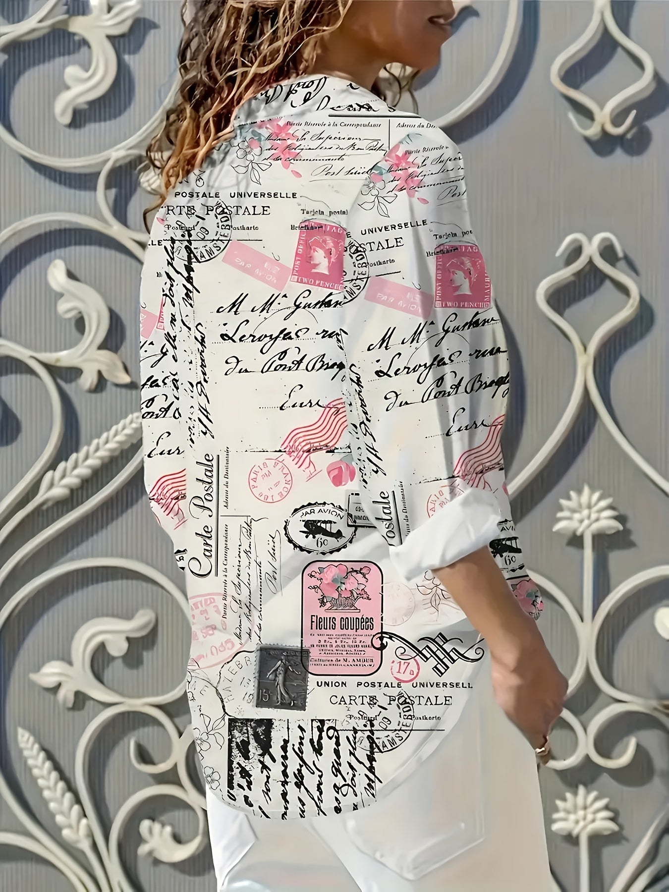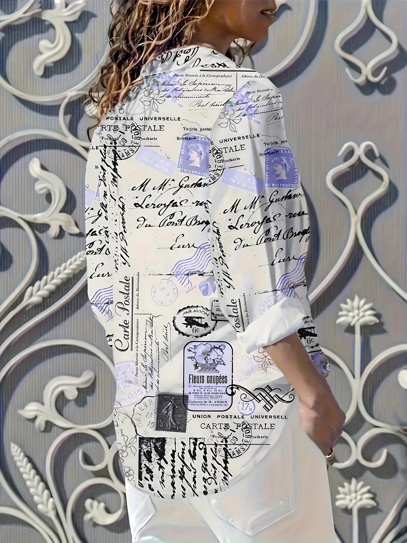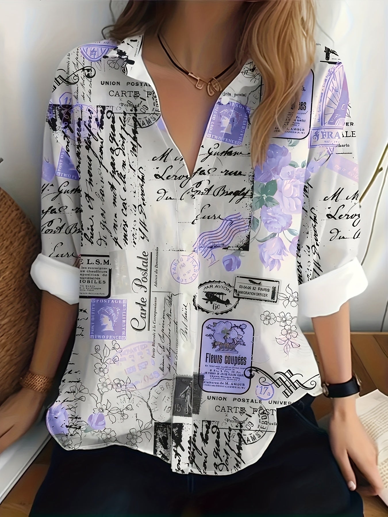 Damska bluzka z długim rękawem z nadrukiem - oddychająca, stylowe guziki