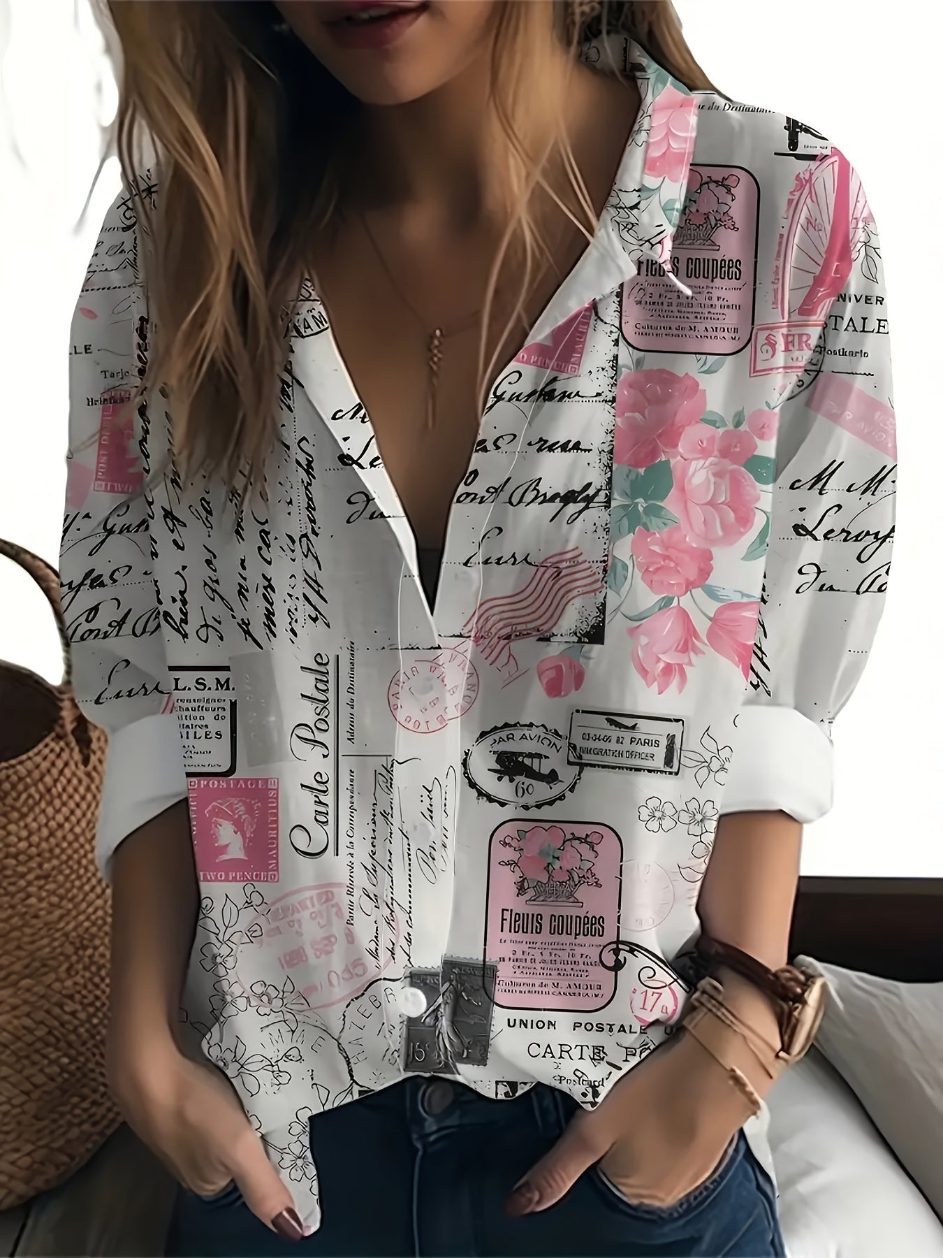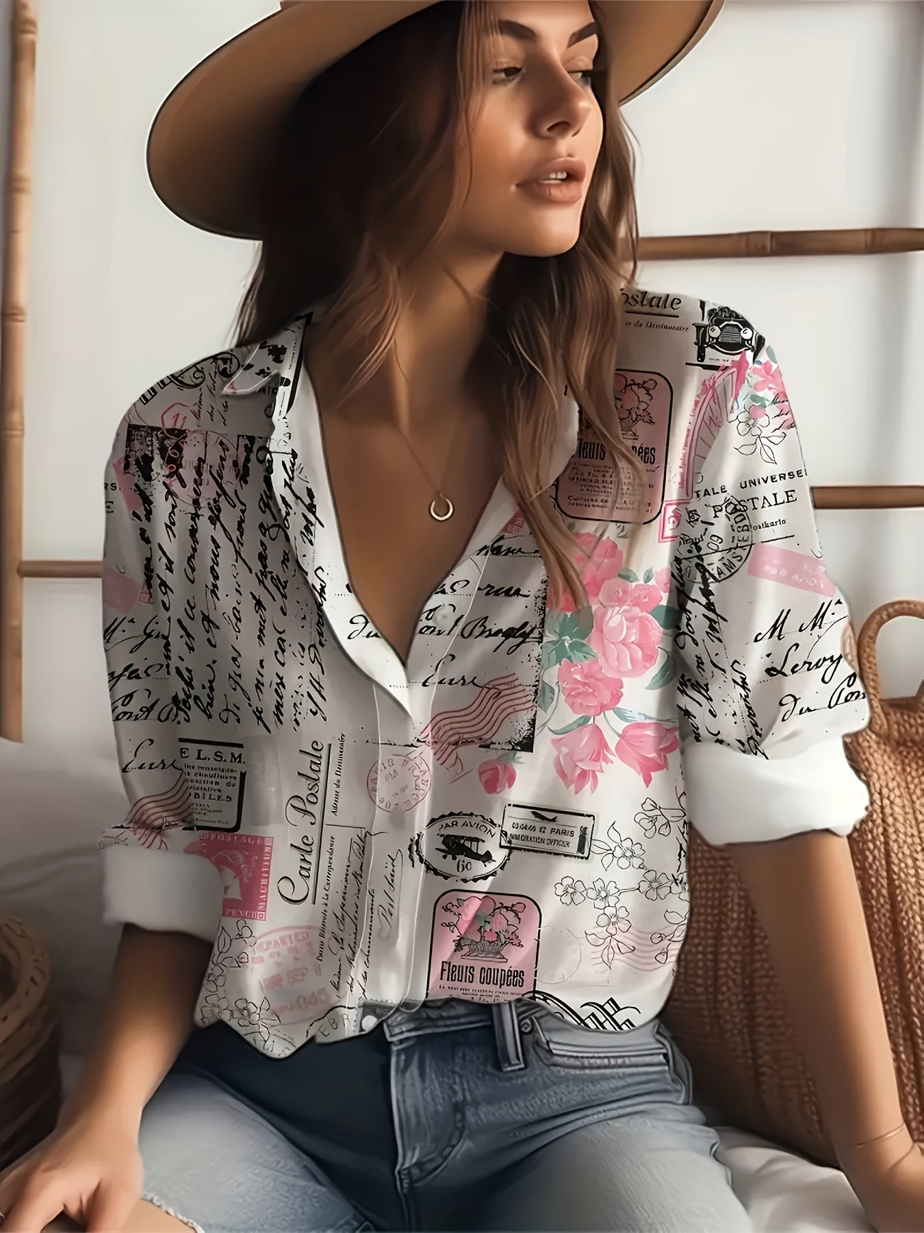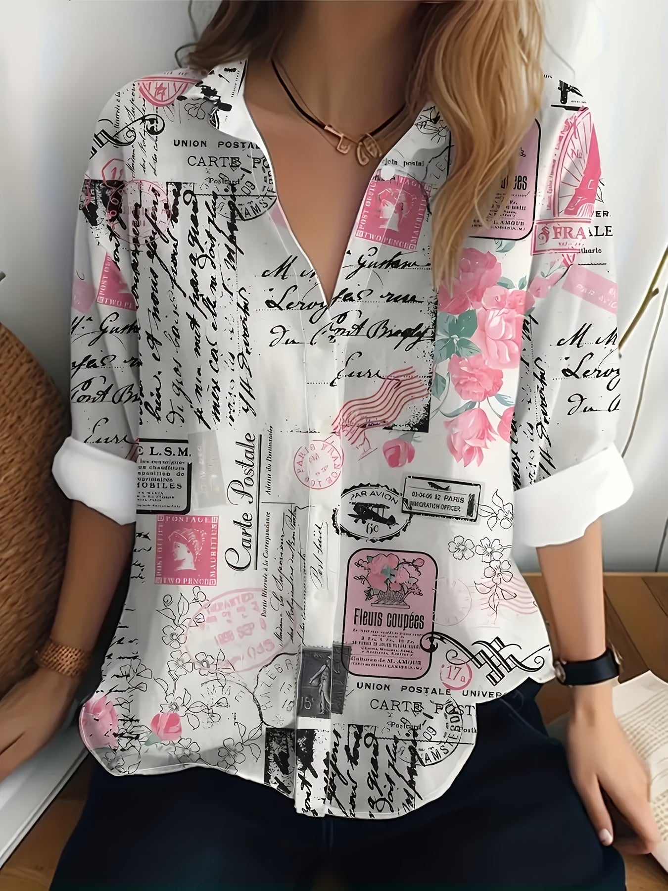 Damska bluzka z długim rękawem z nadrukiem - oddychająca, stylowe guziki