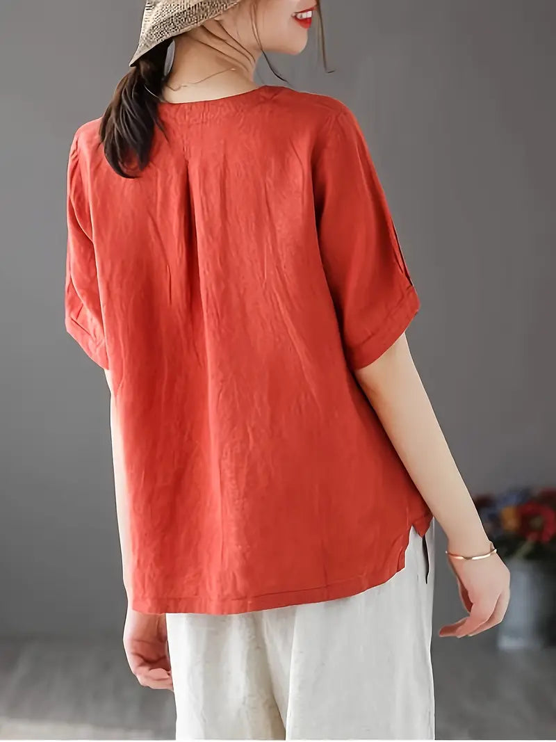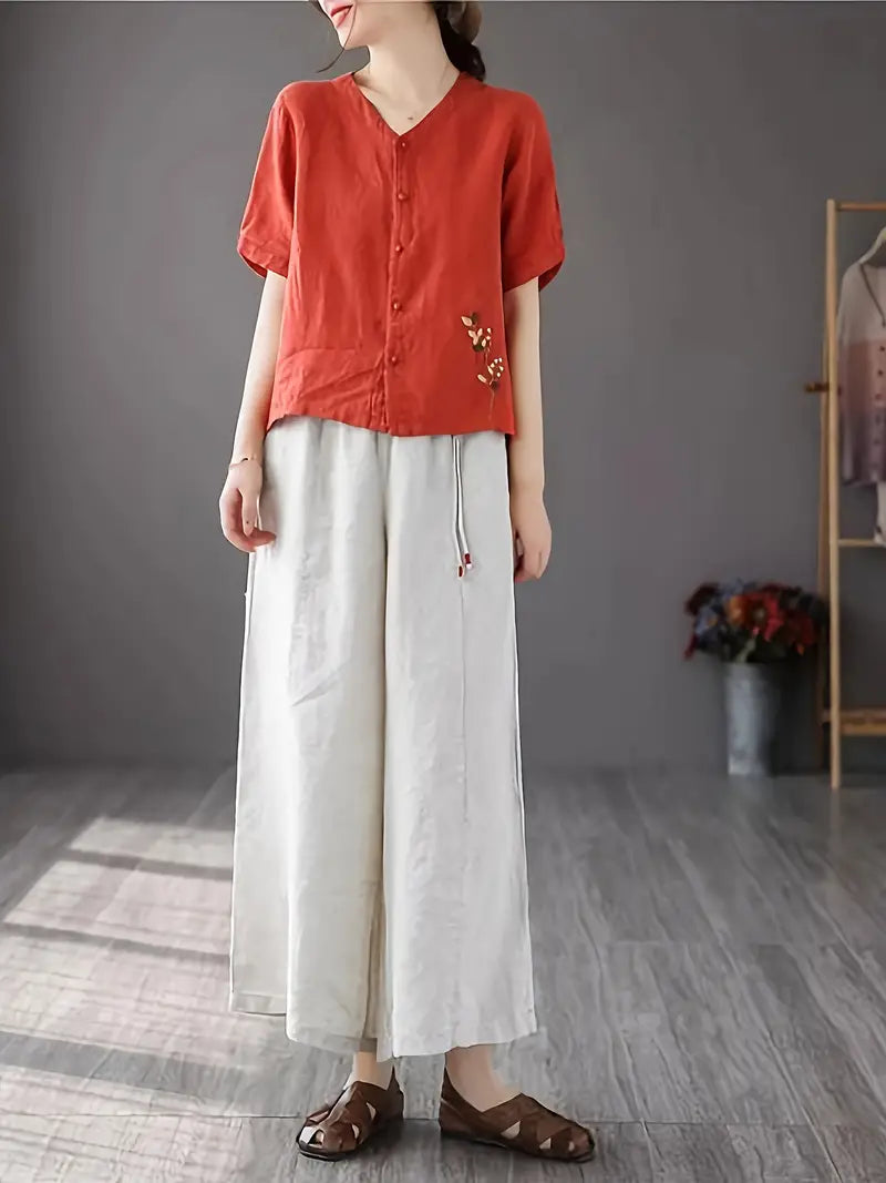 Bluzka z kwiatowym haftem i zapięciem na guziki z przodu