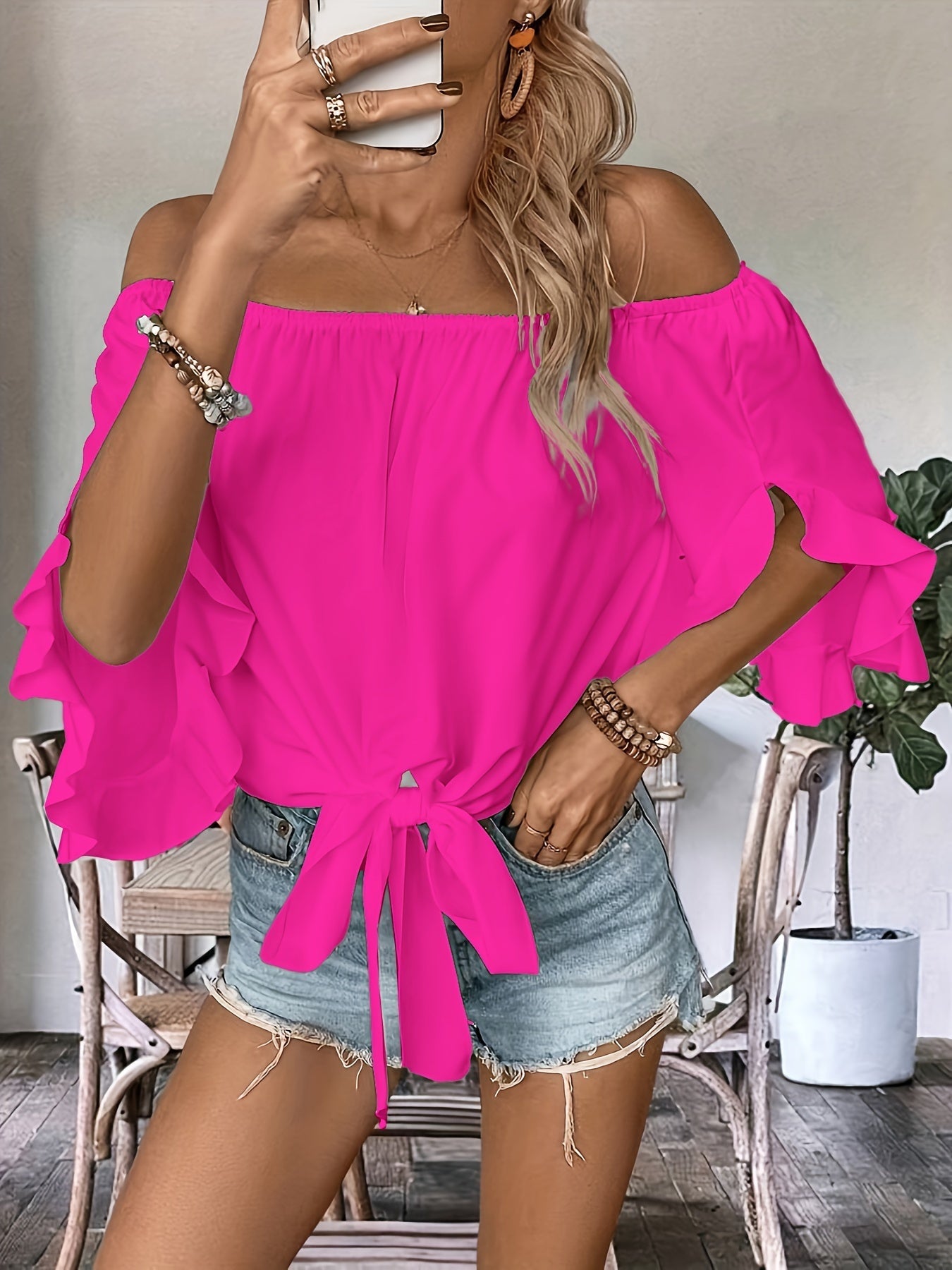Bluzka z odkrytymi ramionami i falbankami - casualowa bluzka damska z wiązanym dołem