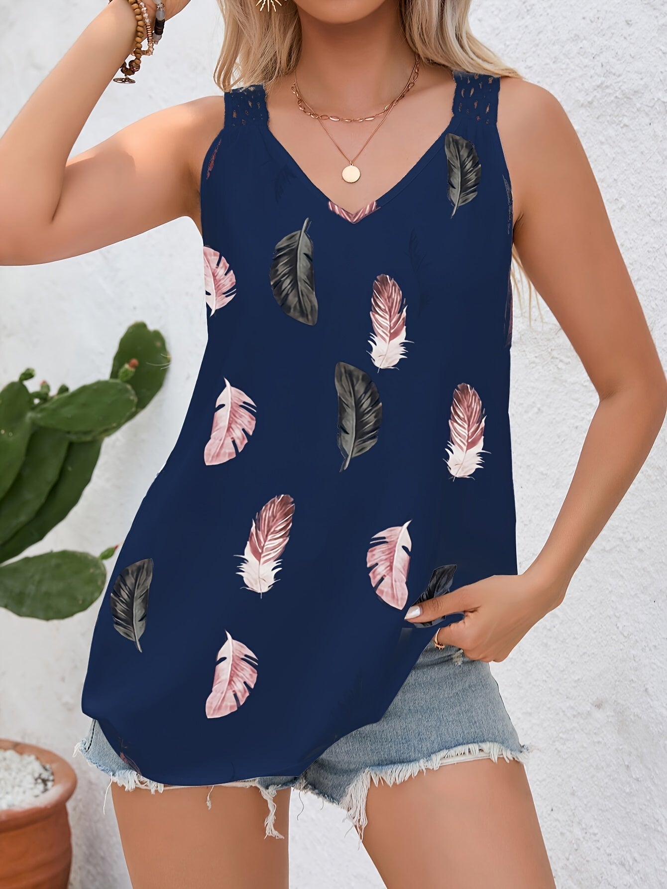 Top z dekoltem V, koronką i nadrukiem – letnia koszulka bez rękawów, oddychająca