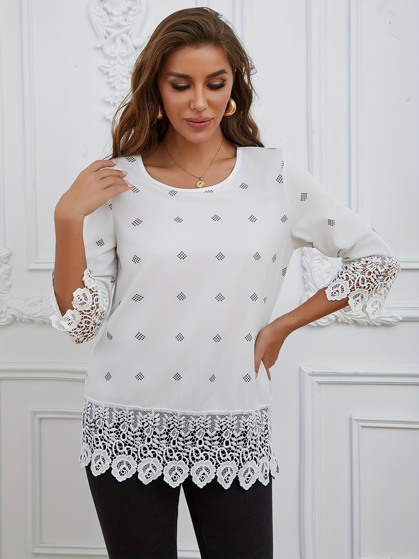 Bluzka z koronkowym wykończeniem, rękawami, okrągłym dekoltem, swobodny wygląd