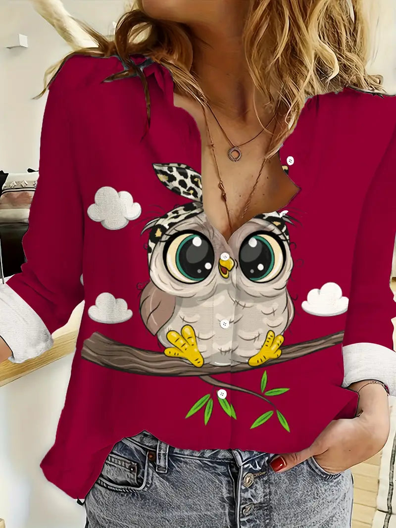 Odkryj wyjątkowy styl naszej casualowej bluzki z długimi rękawami i kołnierzykiem ze szczegółowym nadrukiem sowy. Ta bluzka łączy wygodę z fascynującym designem, który jest idealny zarówno do noszenia na co dzień, jak i na specjalne okazje.