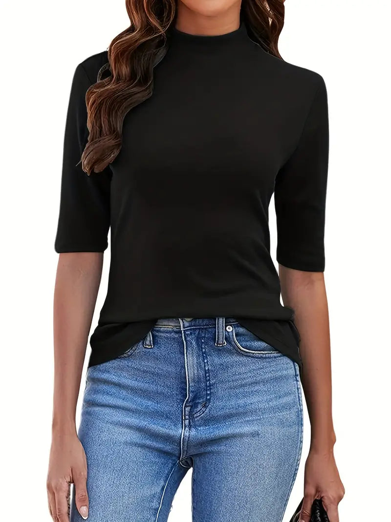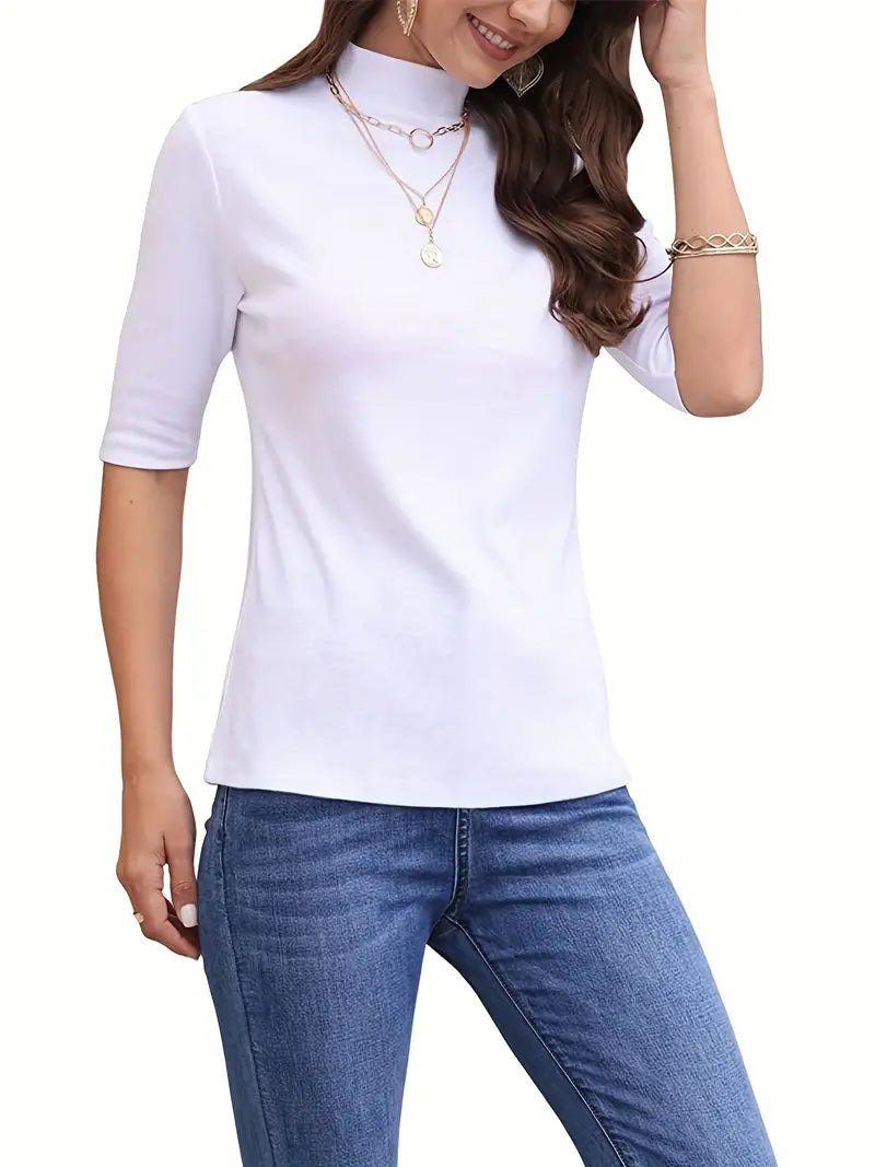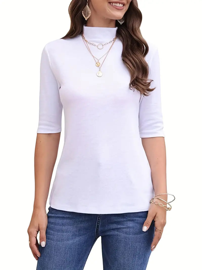 Nasza koszulka Classic Solid Mock Neck to uniwersalny dodatek do wiosennej i jesiennej garderoby. Zaprojektowany z myślą o wygodzie i stylu, ten swobodny top z półrękawkiem ma ponadczasowy dekolt typu crew neck, który dodaje odrobinę wyrafinowania do każdego stroju. Niezależnie od tego, czy nosisz ją pod kurtką, aby uzyskać elegancki wygląd, czy nosisz ją samodzielnie z dżinsami, aby uzyskać swobodny klimat, ta koszulka jest idealna na każdą okazję. Wykonany z wysokiej jakości tkaniny, oferuje zarówno trwałość, jak i oddychalność, zapewniając komfort przez cały dzień. Urozmaić swój codzienny styl tym niezbędnym elementem damskiej garderoby.