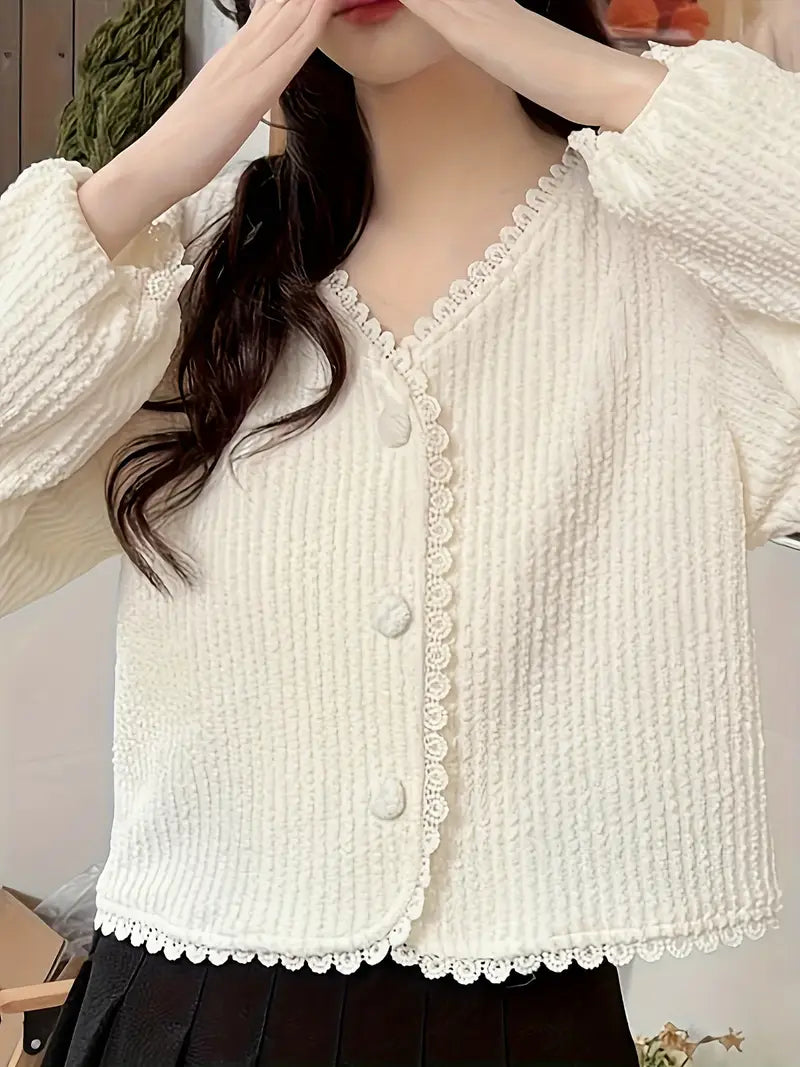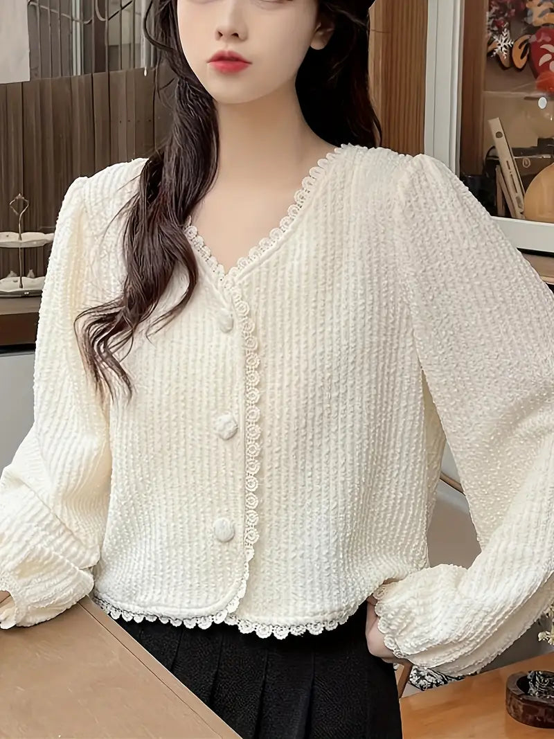 Bluzka damska z plisą guzikową - Jednokolorowa, Długi rękaw, Casual