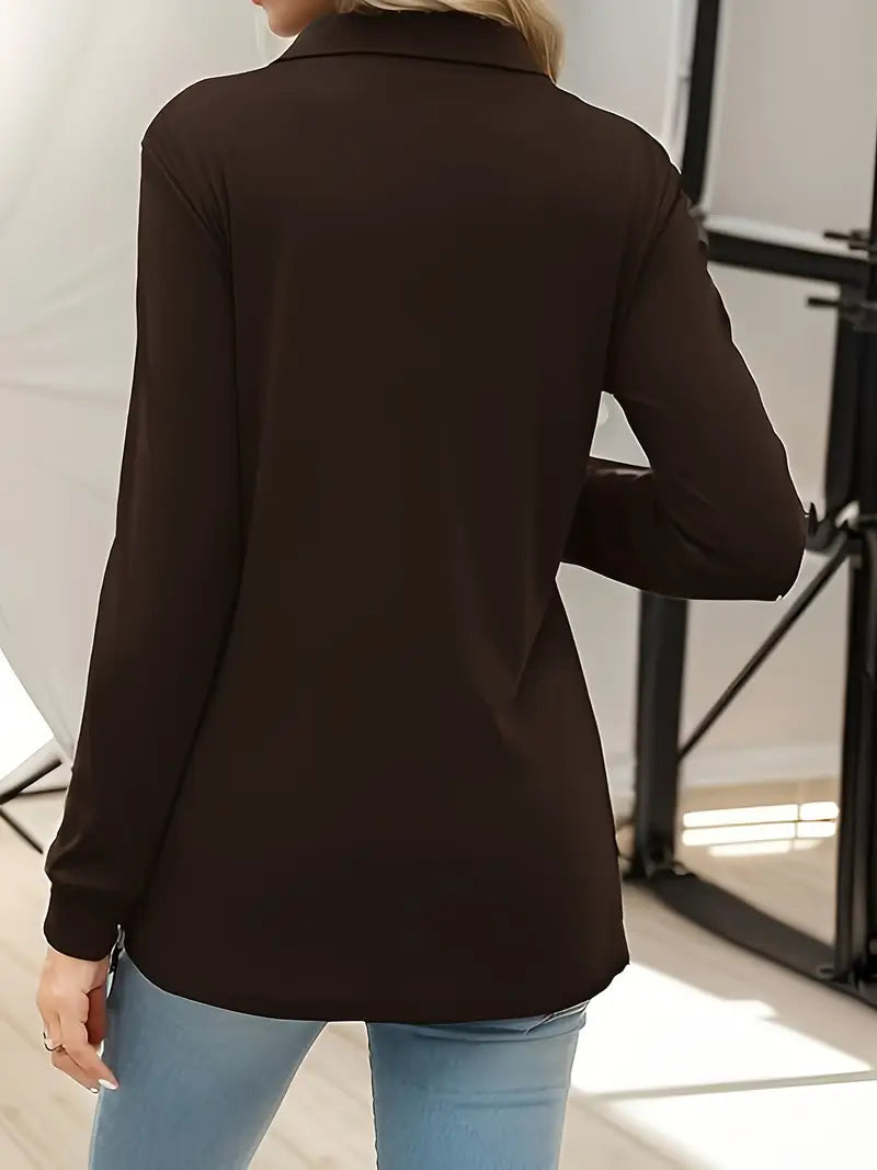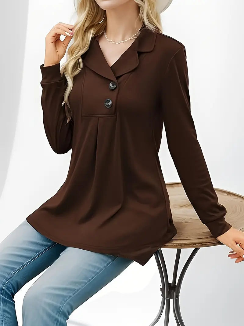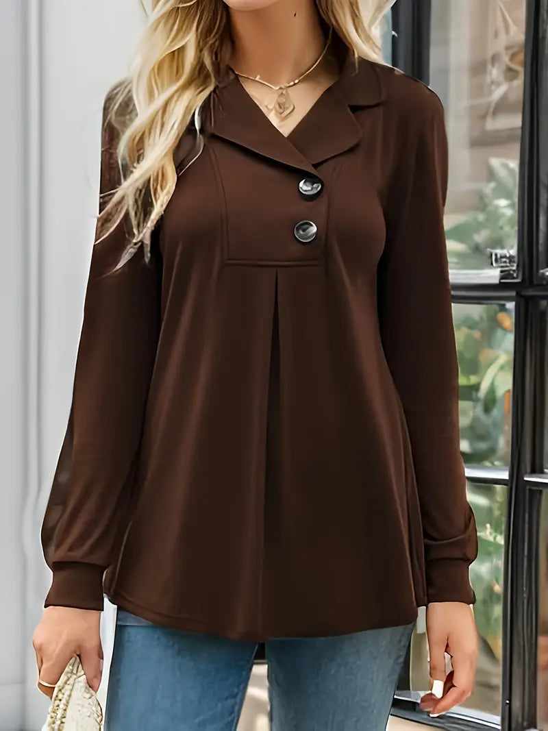 Ta elegancka bluzka damska z klapowym kołnierzykiem i zapięciem na guziki łączy w sobie wygodę i styl. Wykonana z wysokiej jakości poliestru, jest lekka i wytrzymała - idealna do noszenia na co dzień. Luźny krój i swobodny styl sprawiają, że jest idealna do biura, wypoczynku i nie tylko. Dostępna w stylowym brązowym kolorze, będzie pasować do różnych strojów i okazji.