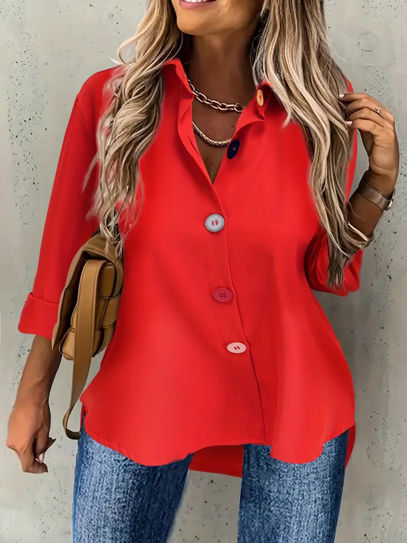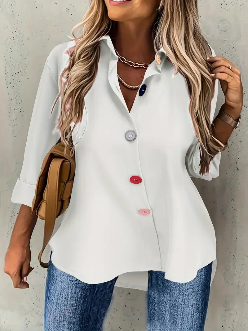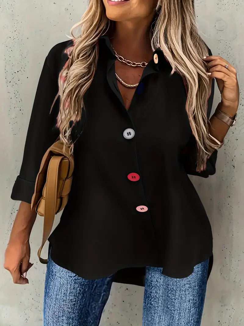 Kolorowa bluzka z długim rękawem i zapięciem na guziki to idealne połączenie stylu i wygody. Idealna dla kobiet szukających uniwersalnego stylu do noszenia na co dzień.