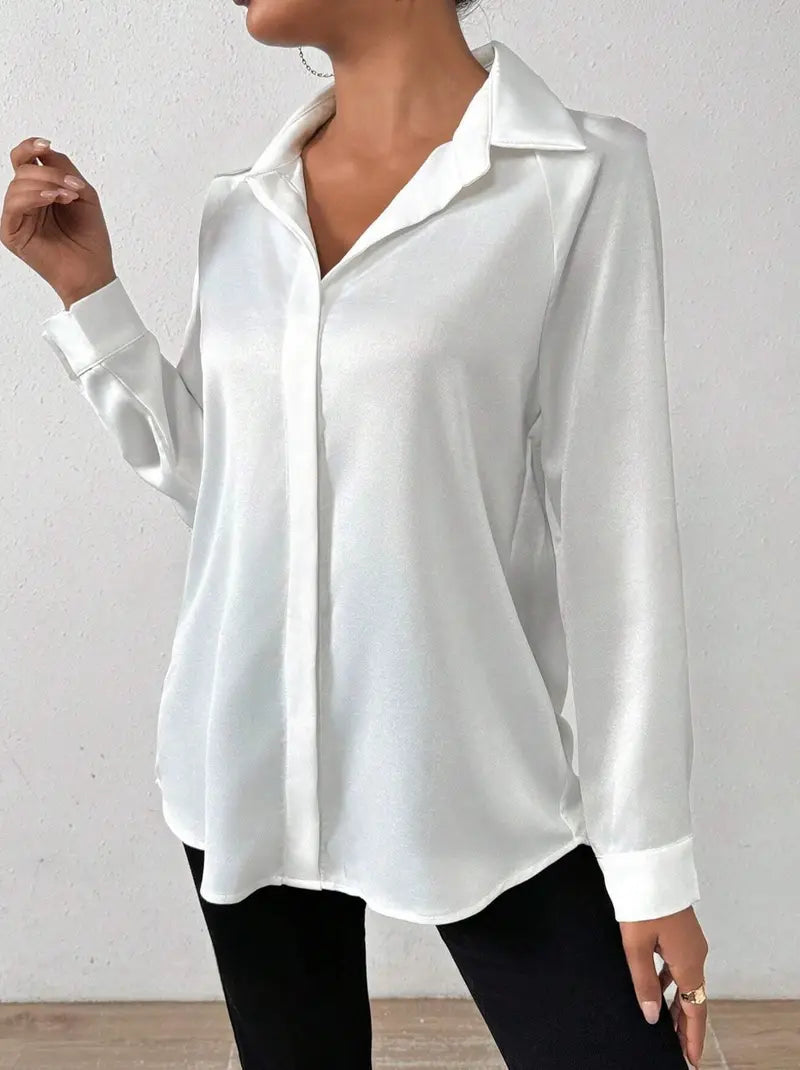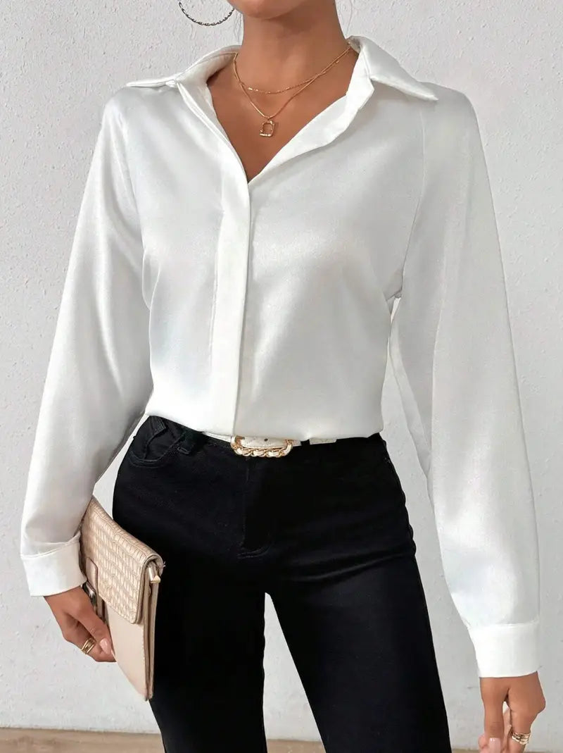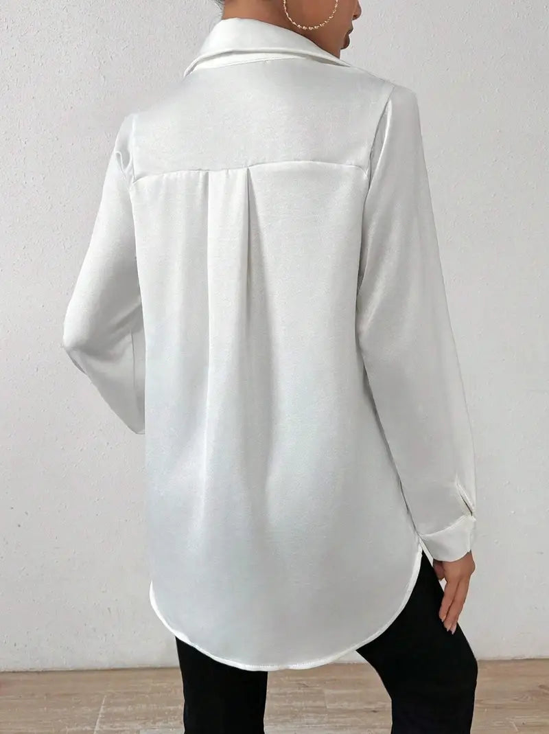 Dodaj odrobinę elegancji do swojego wyglądu dzięki tej białej satynowej bluzce z długim rękawem dla kobiet. Dzięki klasycznej plisie guzikowej i delikatnemu satynowemu materiałowi, ta bluzka jest idealnym towarzyszem zarówno na formalne, jak i swobodne okazje.