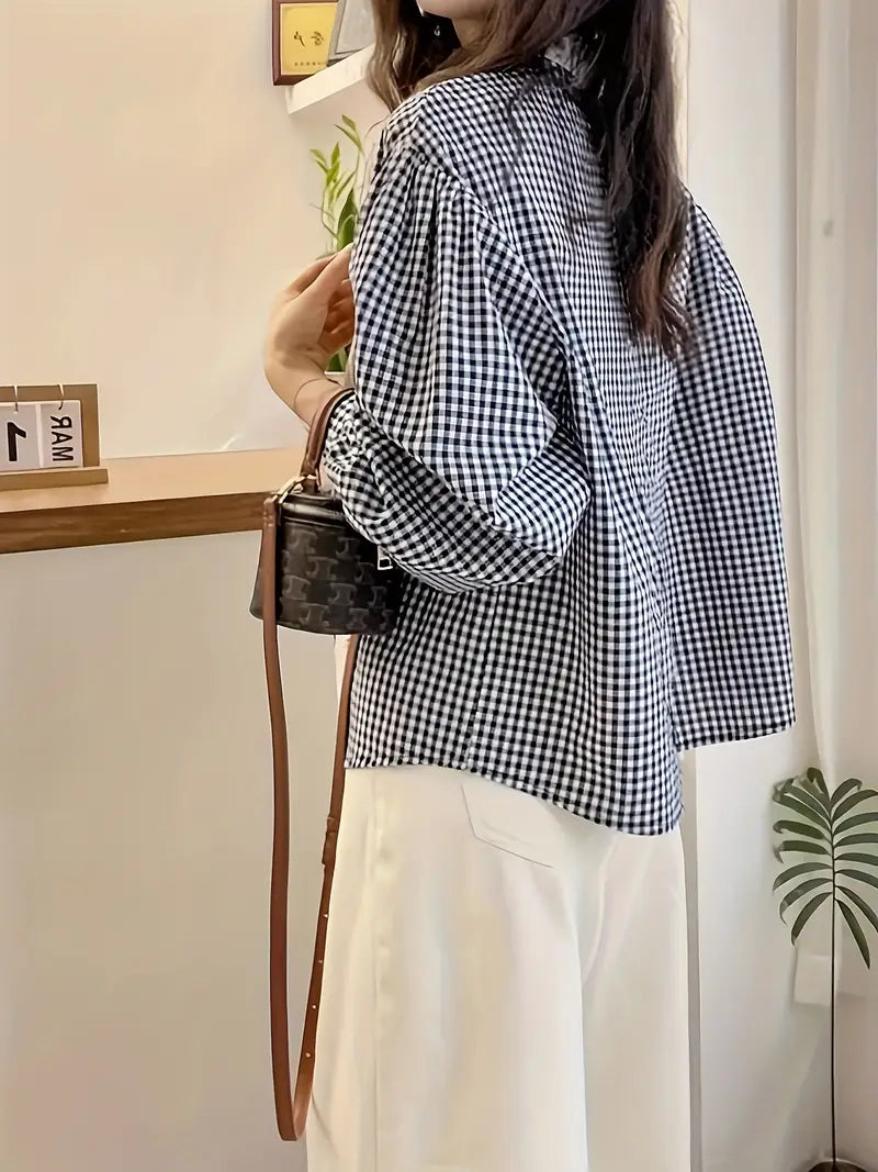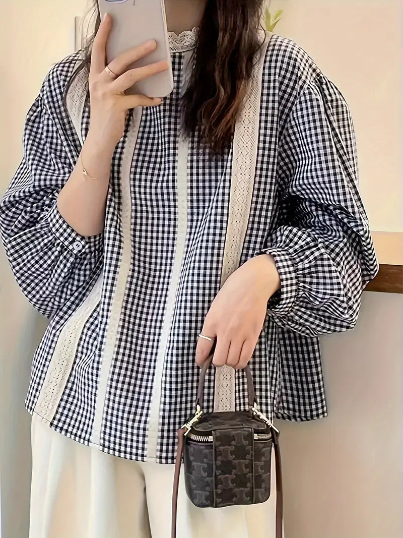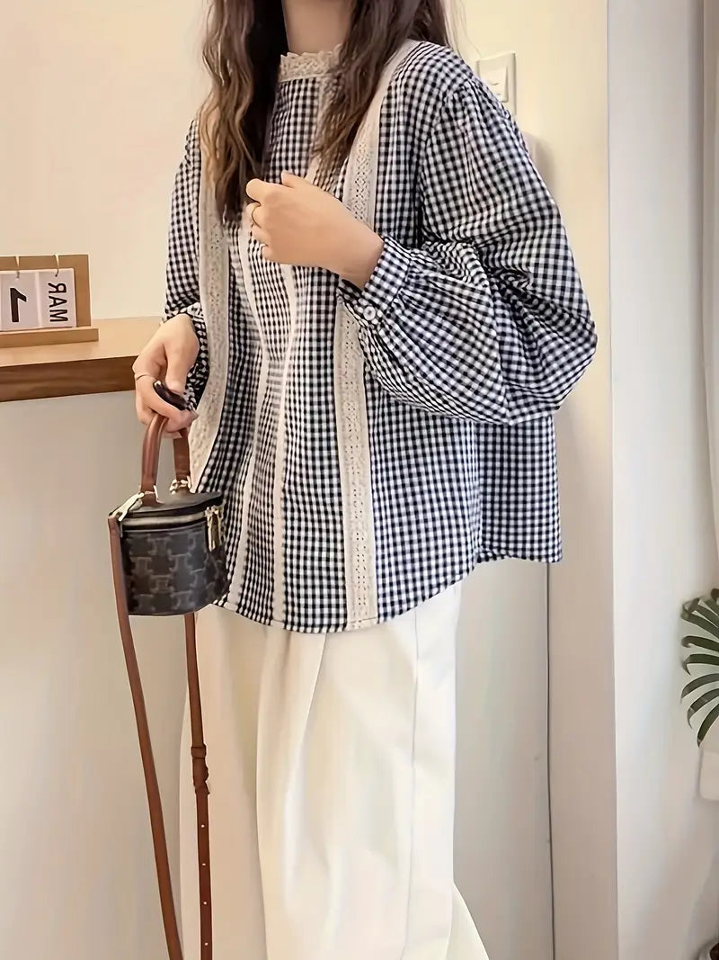 Ta elegancka bluzka w kratę z koronkowym wykończeniem łączy w sobie styl i wygodę i jest idealnym wyborem dla kobiet dbających o modę. Dopasowany do sylwetki krój i miękka mieszanka bawełny i poliestru zapewniają dopasowanie i wygodę. Okrągły dekolt i długie rękawy sprawiają, że bluzka jest uniwersalna, idealna do noszenia na co dzień, do biura lub na specjalne okazje.