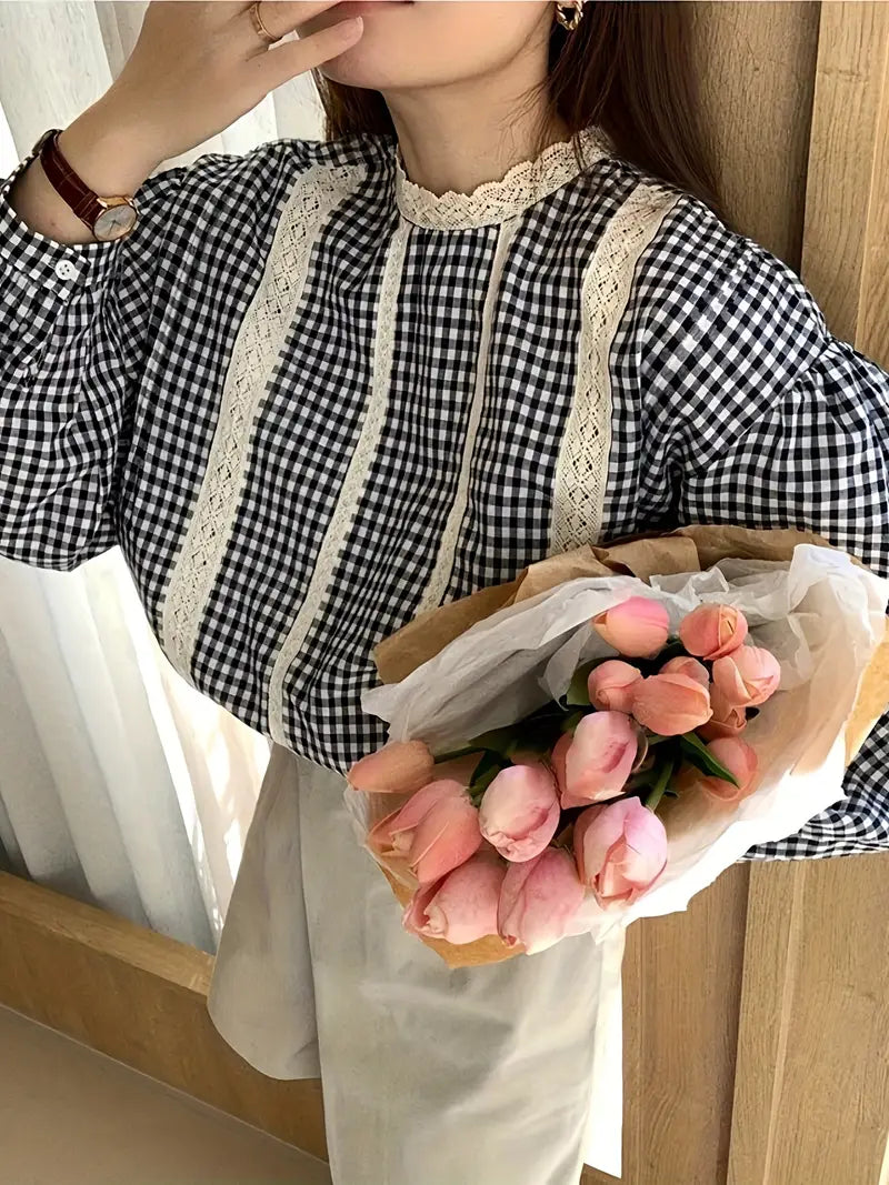 Damska bluzka w kratkę z koronkowym wykończeniem - długi rękaw, dopasowana do figury, okrągły dekolt