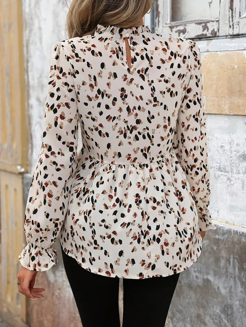 Ta stylowa bluzka damska doskonale łączy w sobie elegancję i wygodę. Dzięki kolorowemu nadrukowi na całej powierzchni i wyrafinowanym detalom, takim jak długie falbaniaste rękawy i marszczony dół, przyciąga wzrok na każdą okazję.