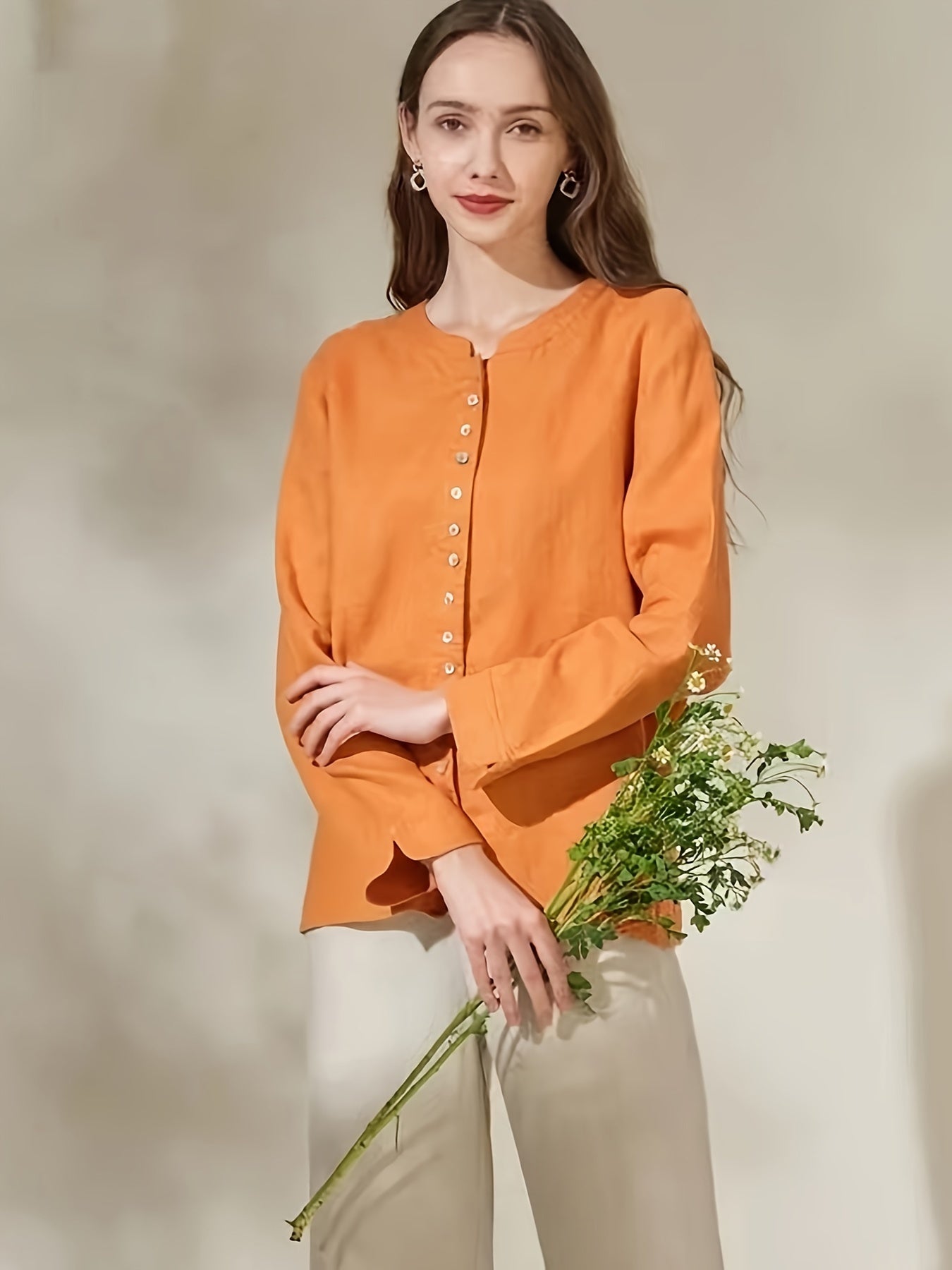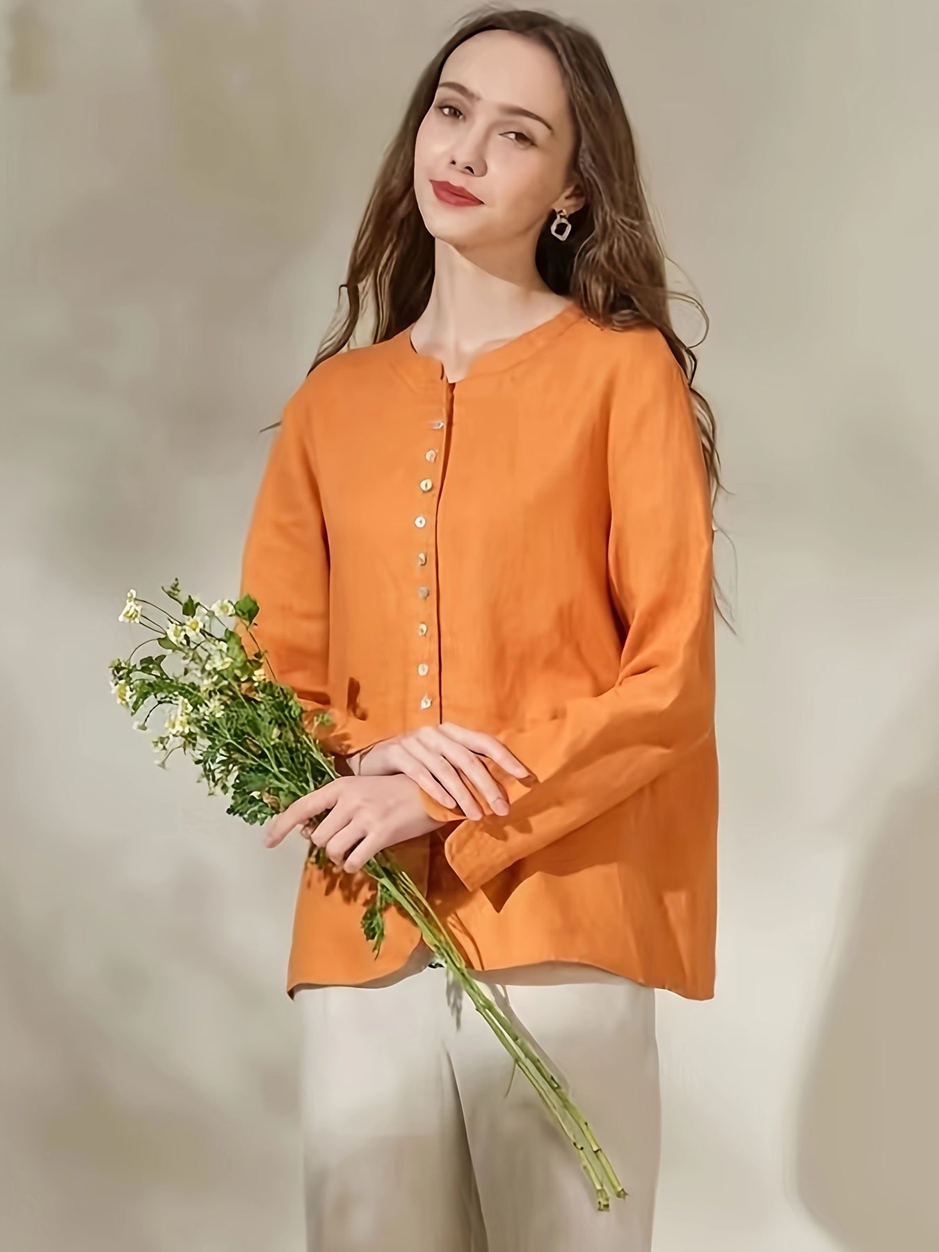 Ta elegancka koszula damska wykonana z lekkiej mieszanki lnianej jest idealnym towarzyszem na ciepłe letnie dni. Dzięki modnemu kołnierzowi stojakowi i oddychającym tkaninie ta bluzka oferuje zarówno komfort, jak i styl. Luźne dopasowanie zapewnia zrelaksowany, ale wciąż elegancki wygląd. Idealna do codziennego użytku lub na specjalne okazje, koszulę można łączyć na różne sposoby.