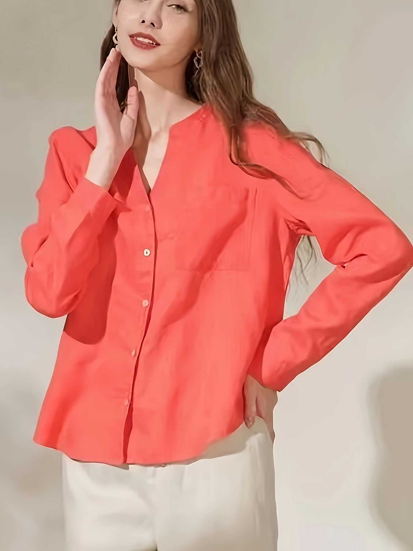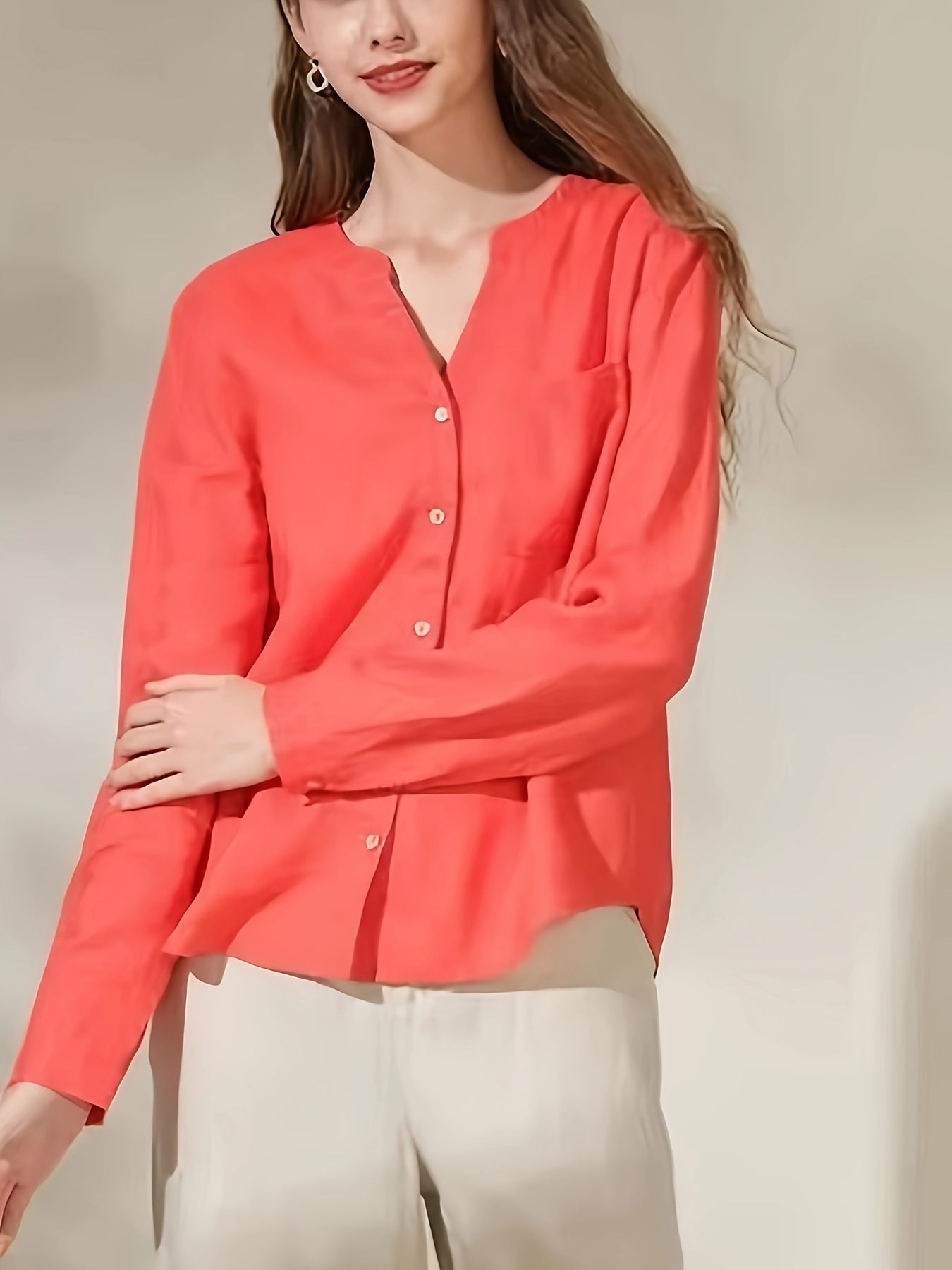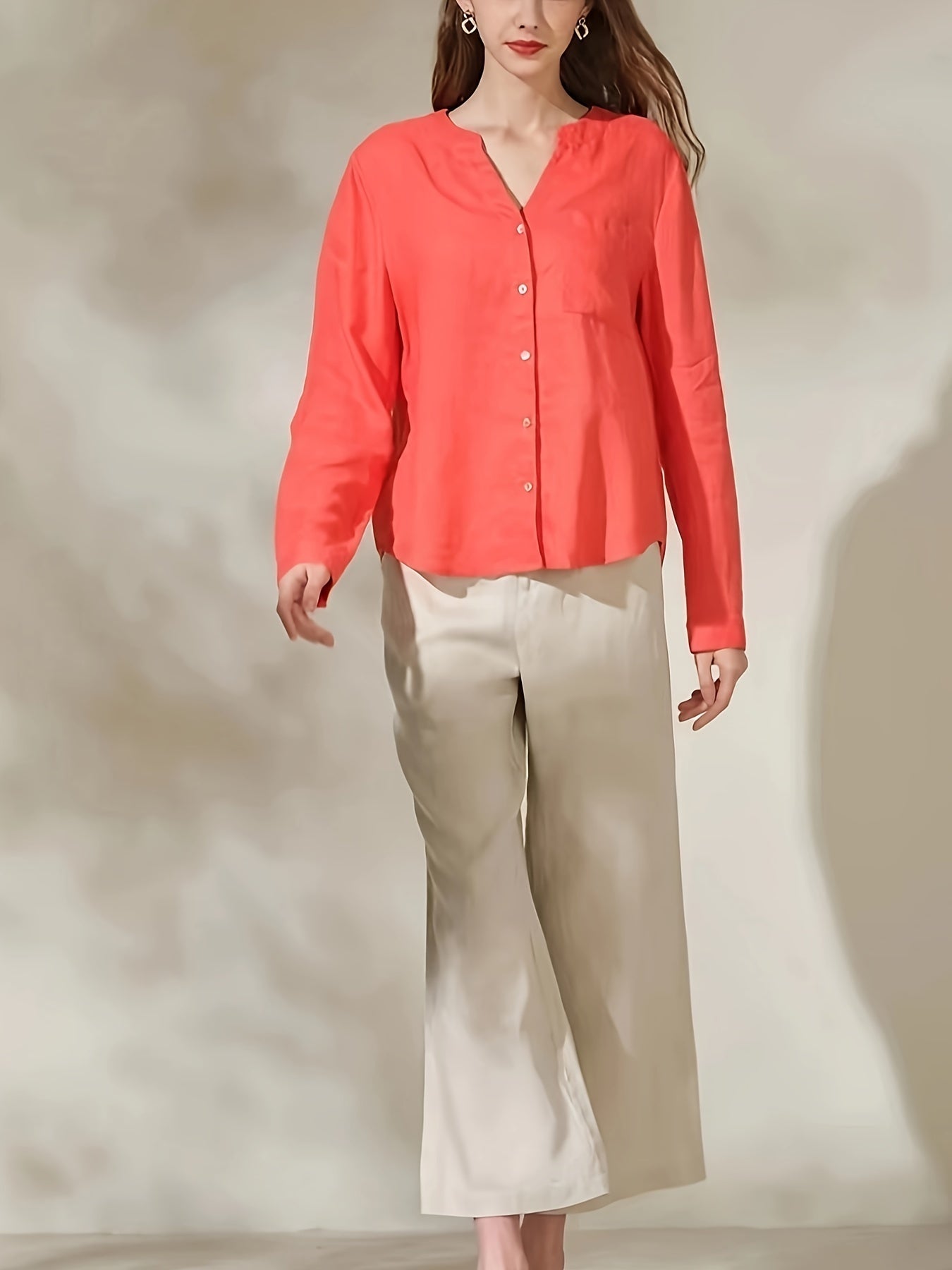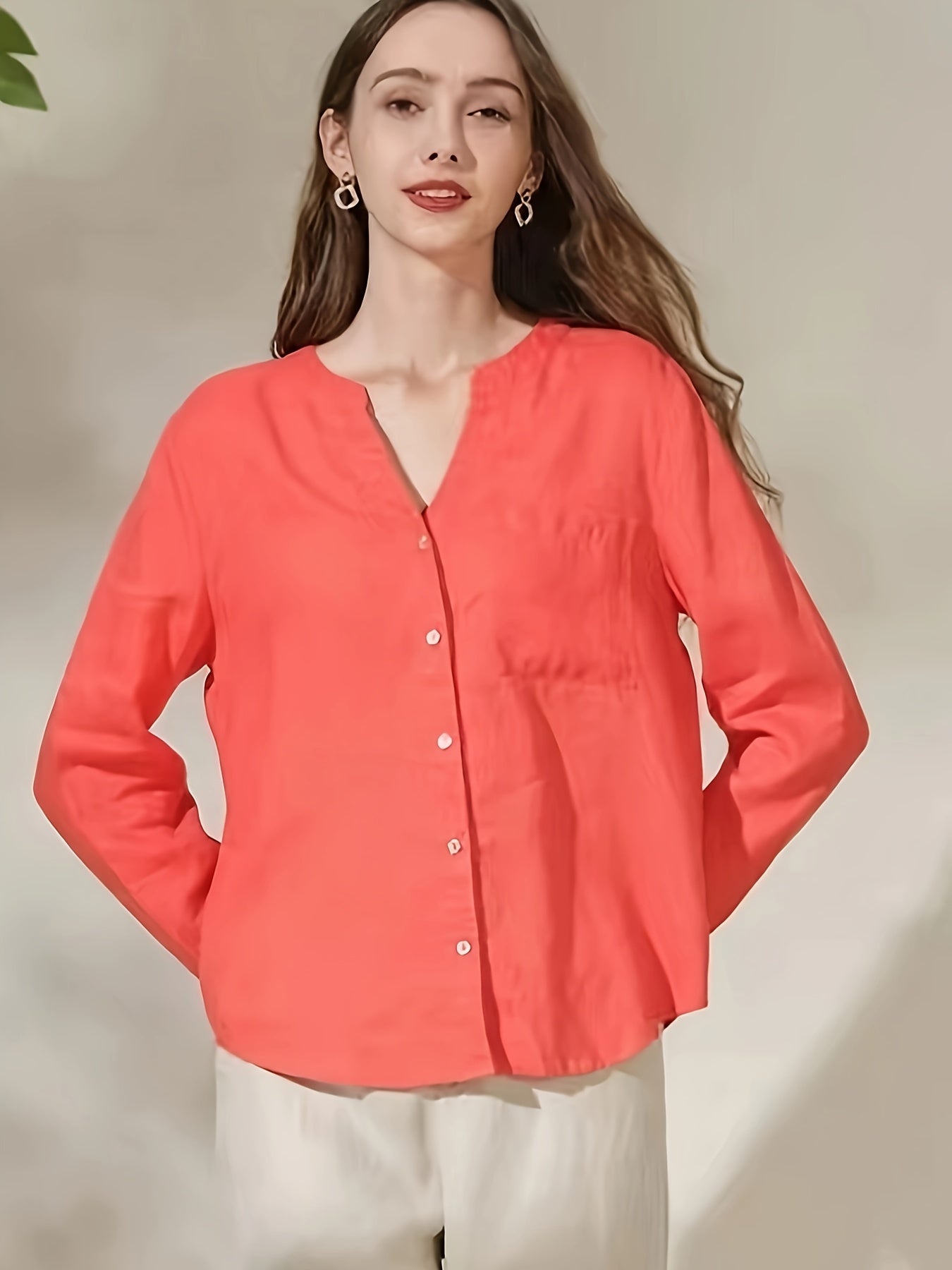 Damska koszula lniana - dekolt V, długi rękaw, lekka i elegancka