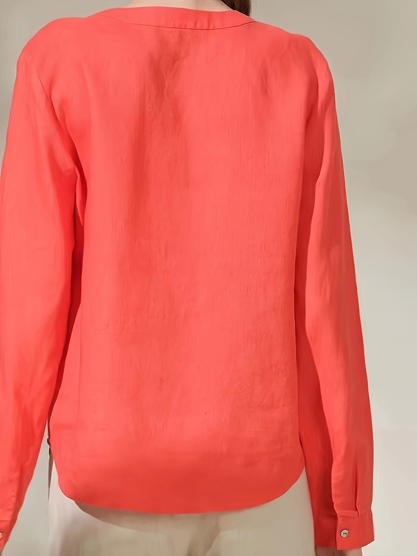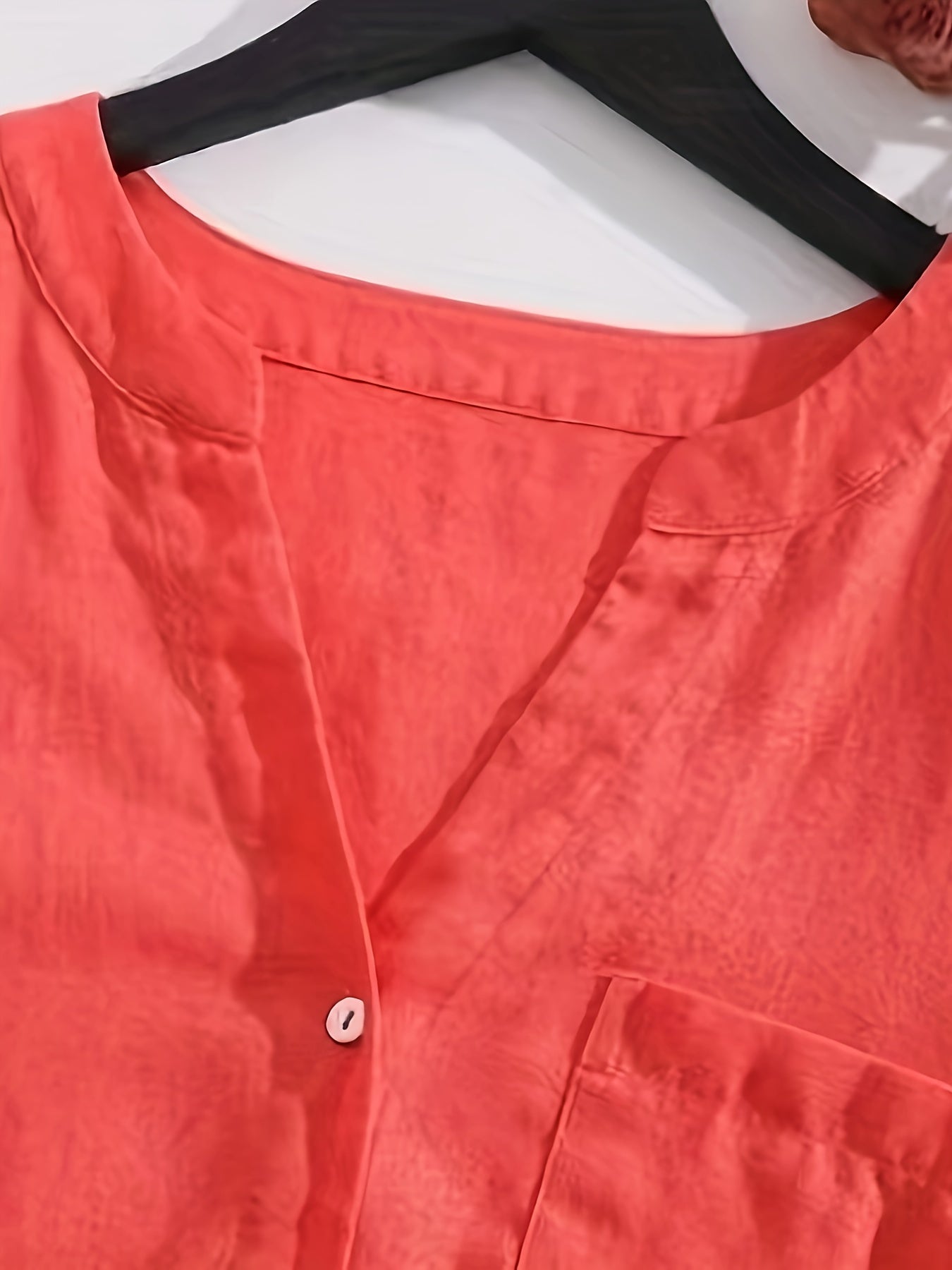 Ta elegancka damska koszula lniana z dekoltem V łączy w sobie lekkość i styl idealny na lato! Wykonana z wysokiej jakości poliestru, zapewnia przewiewność i wysoki poziom komfortu. Długie rękawy i luźny krój zapewniają pochlebne dopasowanie, a minimalistyczny design jest wszechstronny - idealny do biura, wypoczynku lub podróży. Niezależnie od tego, czy jest noszona z dżinsami, spodniami czy spódnicami, ta koszula doda stylowego charakteru każdej stylizacji. Dostępna w [jednym] kolorze, jest obowiązkowym elementem każdej letniej garderoby.