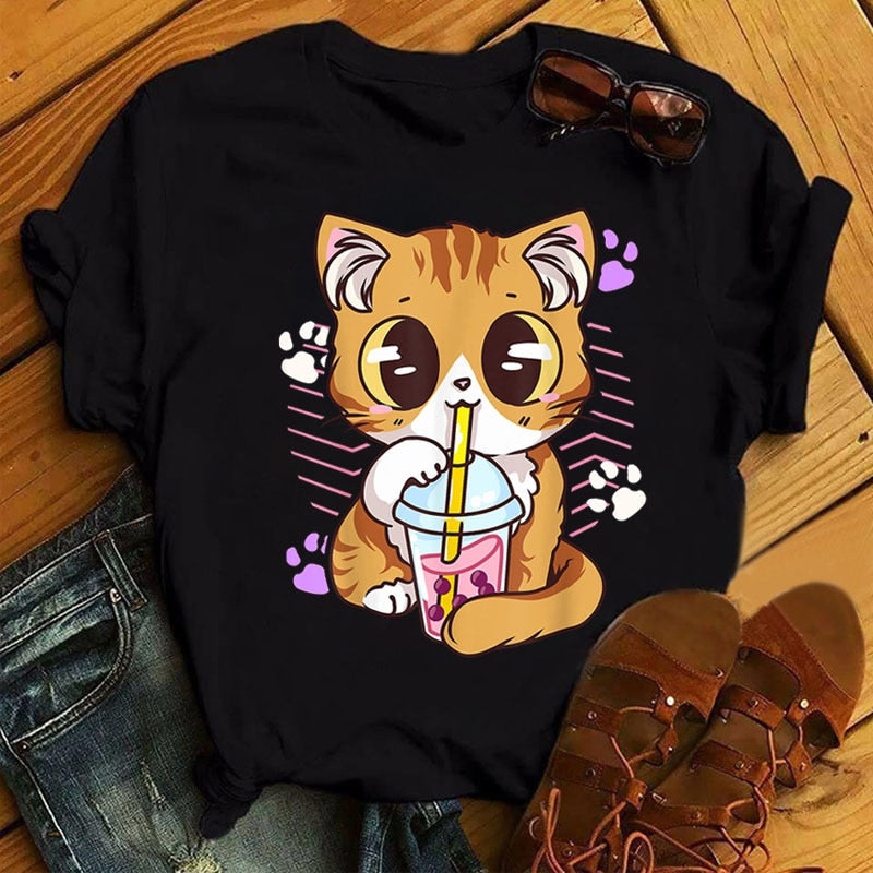 Damska koszulka z kocim motywem i bubble tea