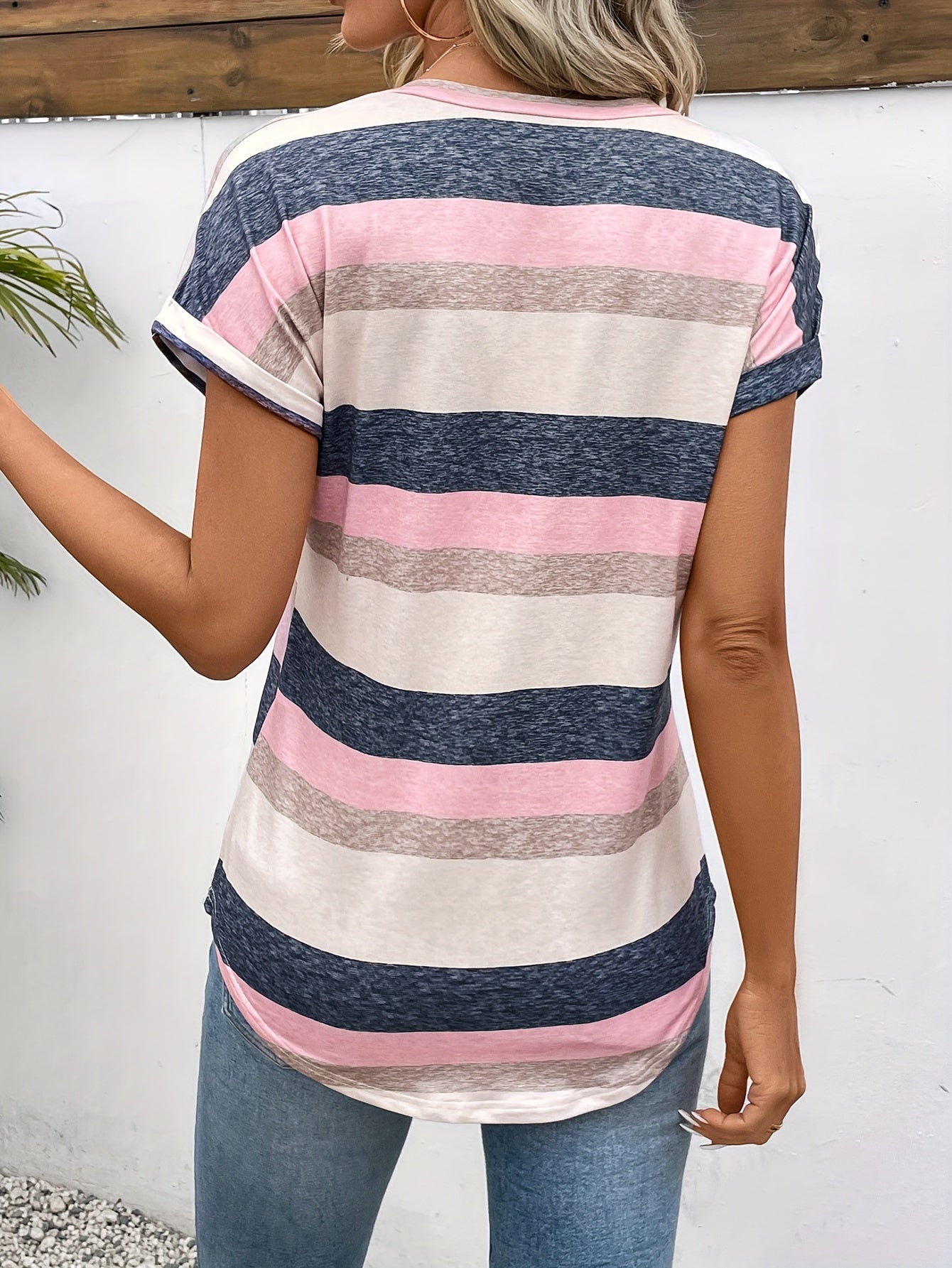Letnia lniana koszulka w paski łączy w sobie styl i wygodę i jest idealna na ciepłe dni! Wykonany z lekkiego, oddychającego poliestru, jest wygodny w noszeniu i zapewnia chłód nawet w wysokich temperaturach. Luźny krój zapewnia optymalną swobodę ruchów, a elegancki wzór w paski tworzy nowoczesny wygląd. Wszechstronny - idealny do dżinsów, spódnic lub szortów na czas wolny, do biura lub na wakacje. Dostępna w [jednym] kolorze, ta koszulka to stylowy must-have każdej letniej garderoby.