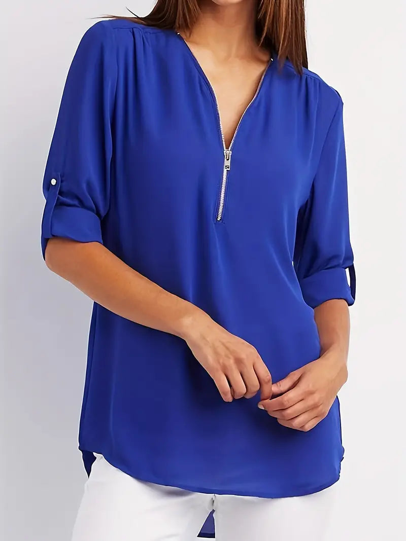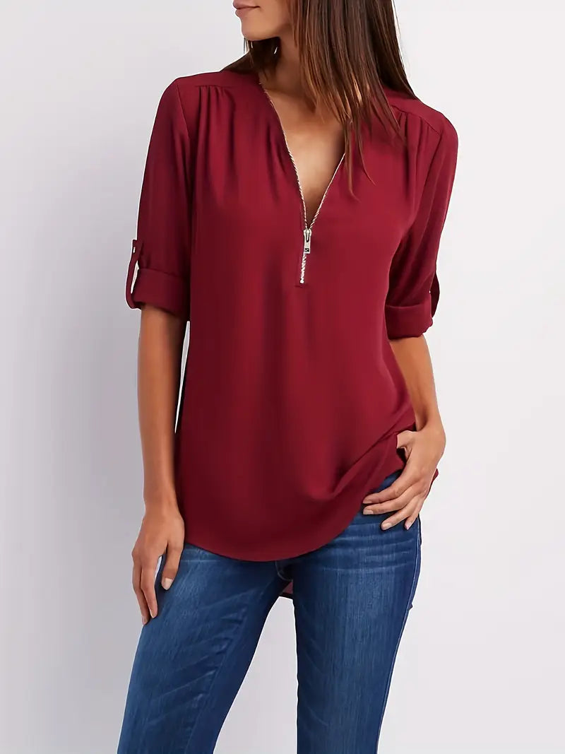 Ulepsz swoją garderobę dzięki tej eleganckiej bluzce z dekoltem w serek w dużych rozmiarach, zaprojektowanej z myślą o niewymuszonej elegancji i komforcie przez cały dzień. Wykonana z miękkiej i oddychającej mieszanki poliestru, ta bluzka z długim rękawem oferuje pochlebny regularny krój z lekkim rozciągnięciem dla dodatkowej swobody ruchów. Stylowy dekolt w kształcie litery V podkreśla sylwetkę, a zamek błyskawiczny dodaje nowoczesności. Idealna na swobodne wyjścia, weekendowe stylizacje, a nawet do biura. Ta wszechstronna bluzka pięknie komponuje się z dżinsami, spódnicami lub eleganckimi spodniami, zapewniając wyrafinowany wygląd.