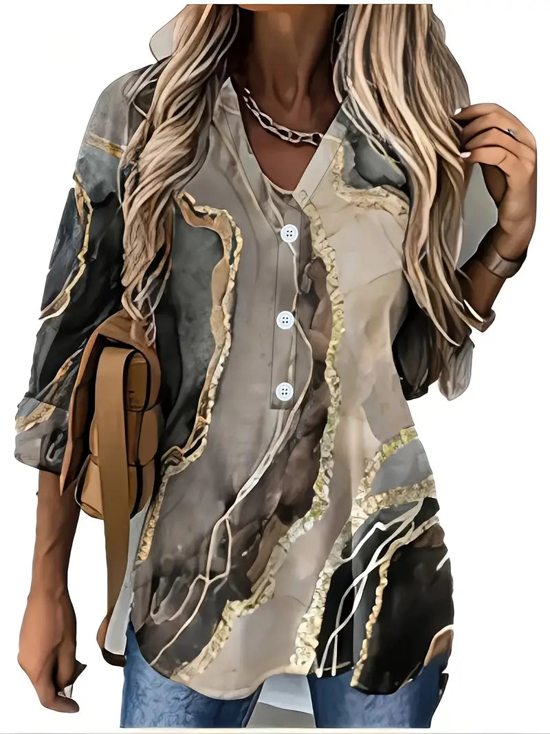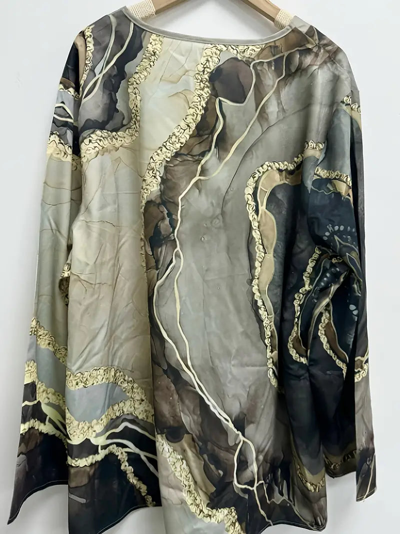 Duże rozmiary Bluzka z marmurkowym nadrukiem - Elegancki dekolt V, długie rękawy