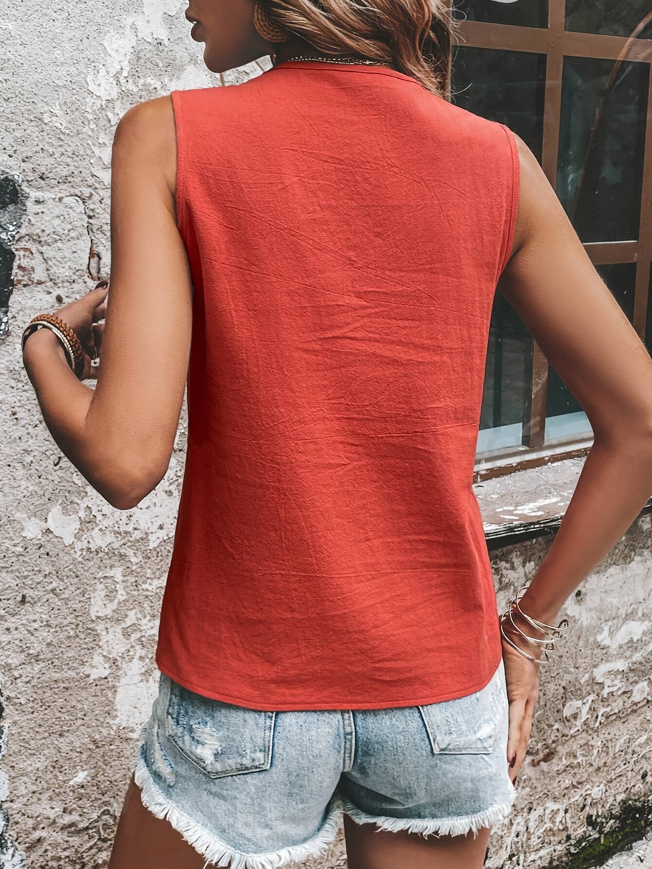 Ta piękna bluzka w stylu vintage z dekoltem w szpic i koronkową jest elegancki styl z przyjemnym komfortem. Oddychający materiał zapewnia lekki dopasowanie, idealne na ciepłe letnie dni. Dopasowanie bez rękawów i luźne cięcie sprawiają, że jesteś wszechstronnym elementem, który jest odpowiedni do codziennego życia i specjalnych okazji. Delikatna końcówka na dekolcie nadaje bluzce kobiecy akcent.