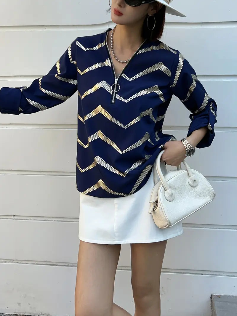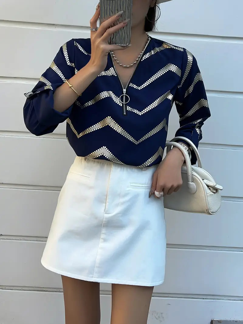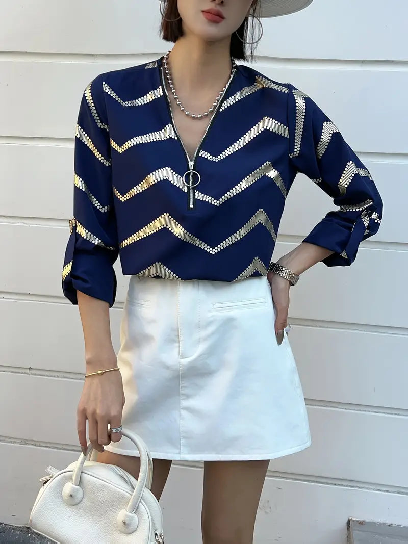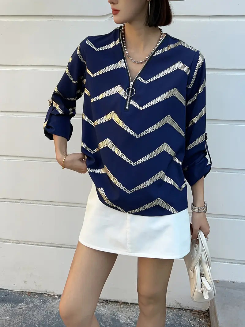 Elegancka kobaltowo-niebieska bluzka z dekoltem w serek - półzamek błyskawiczny z nadrukiem w jodełkę i mankietami