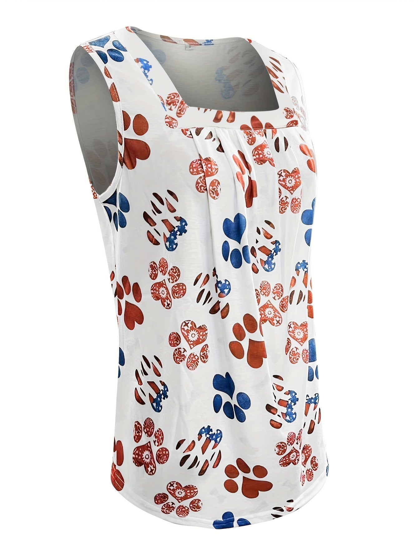 Elegancki top bez rękawów z nadrukiem kwiatowym i łapami oraz plisowanym dekoltem