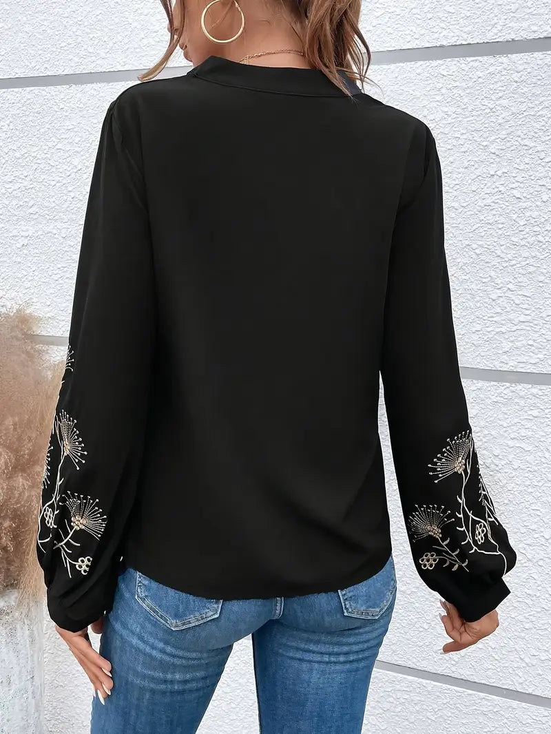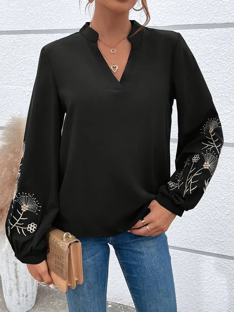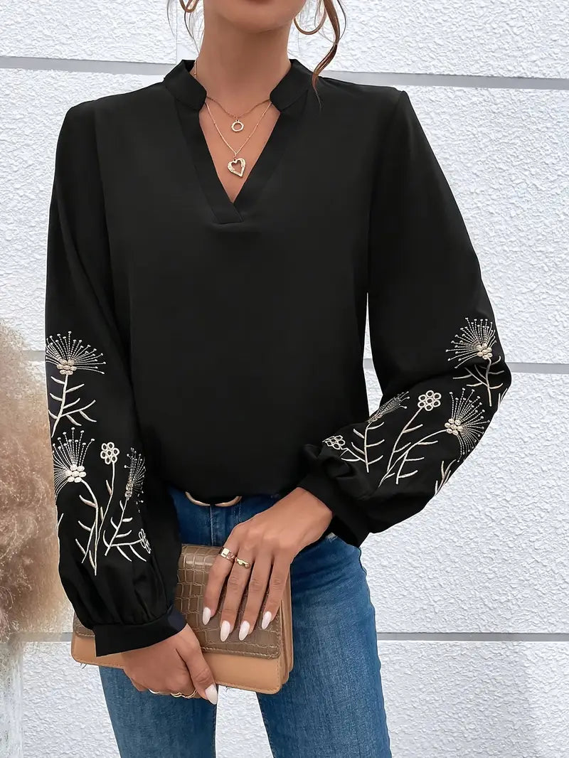 Elegancka bluzka z długim rękawem z haftem i dekoltem w kształcie litery V łączy w sobie ponadczasowy styl i wygodę. Wykonana z wysokiej jakości poliestru bluzka zapewnia swobodny, ale elegancki wygląd na każdą okazję. Delikatny haft i pochlebny dekolt w kształcie litery V sprawiają, że jest idealnym towarzyszem do pracy, wypoczynku i na specjalne okazje.