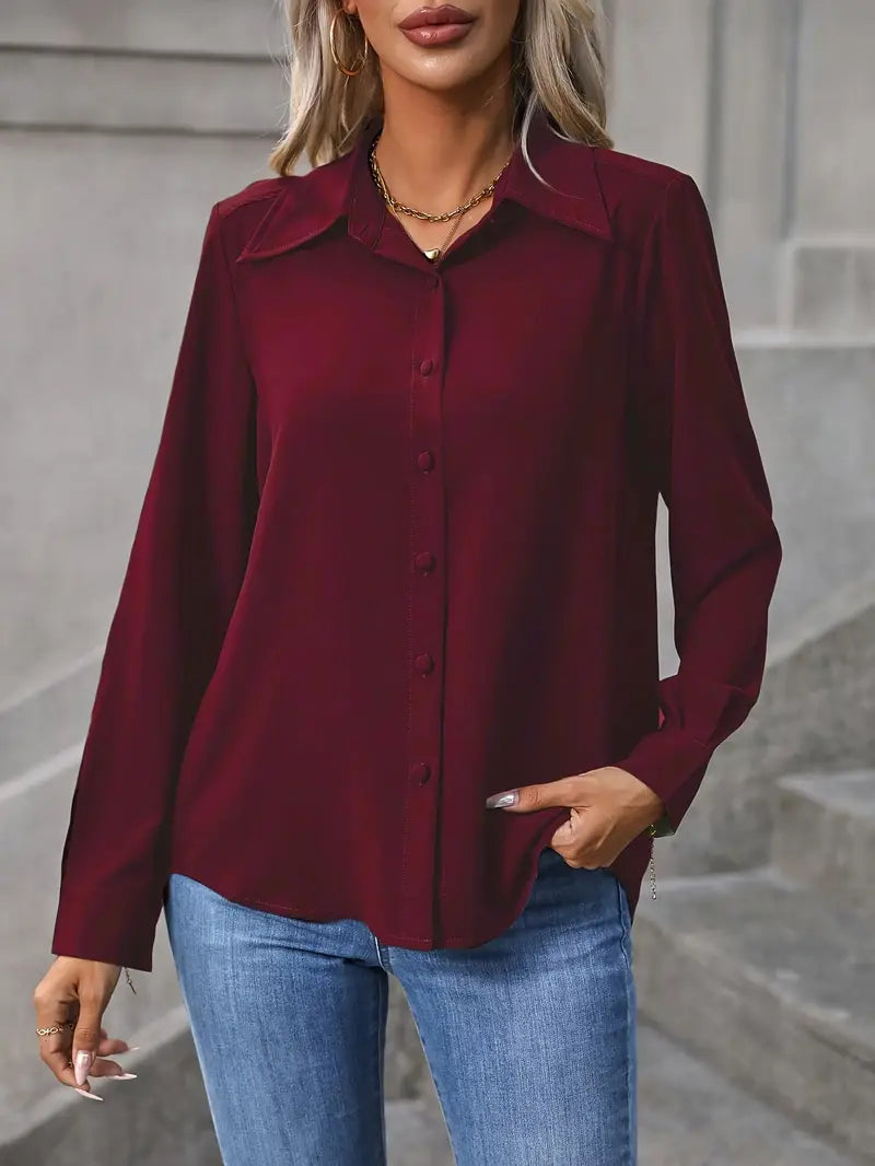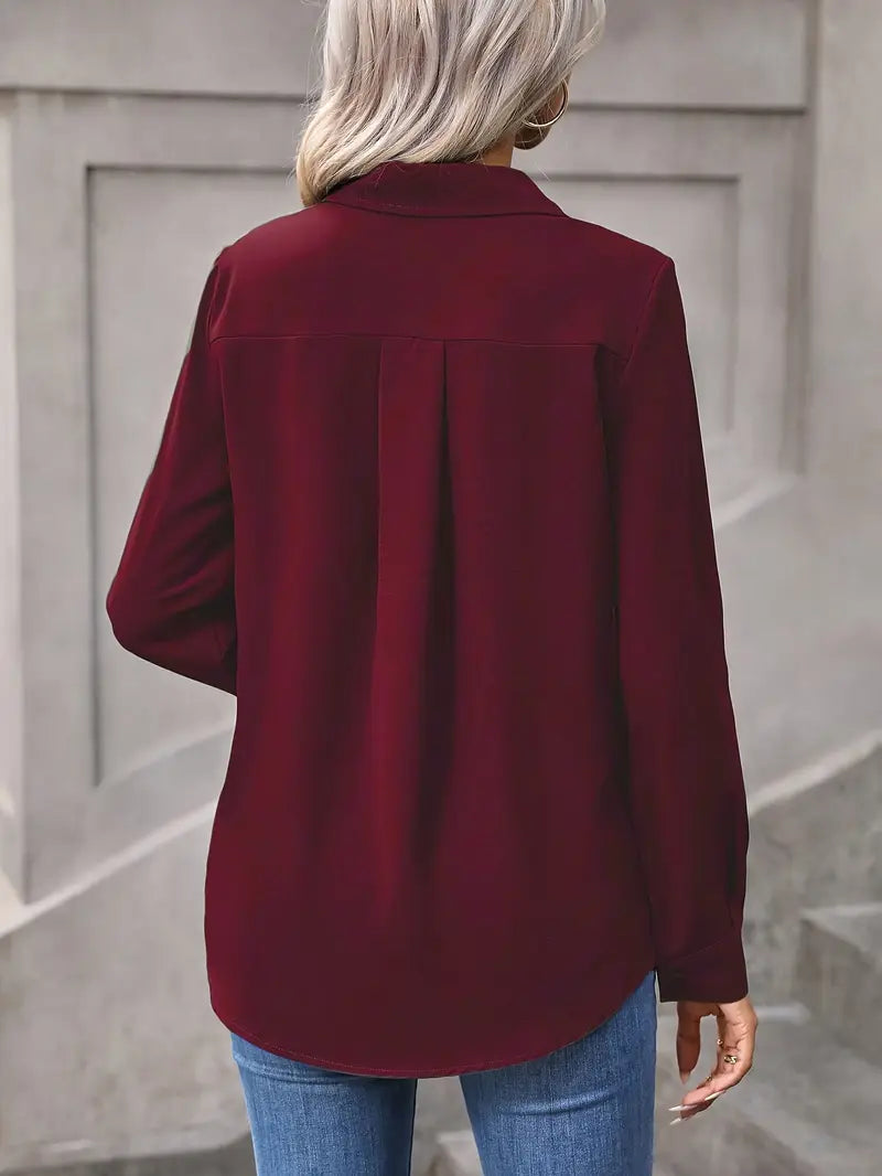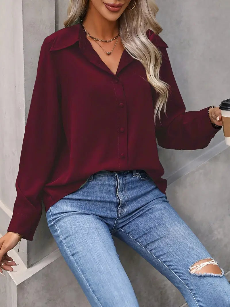Elegancka czerwona satynowa koszula na guziki z długim rękawem i klapowym kołnierzykiem