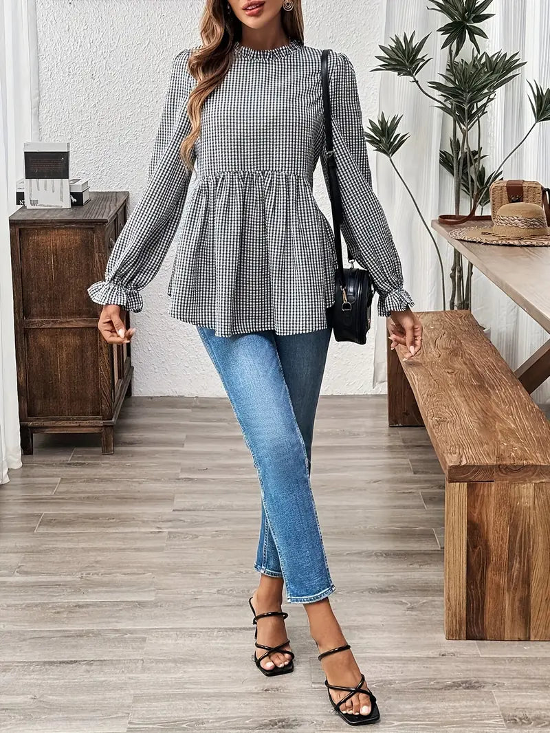 Bluzka Gingham - marszczony kołnierzyk, długie rękawy, wzór peplum