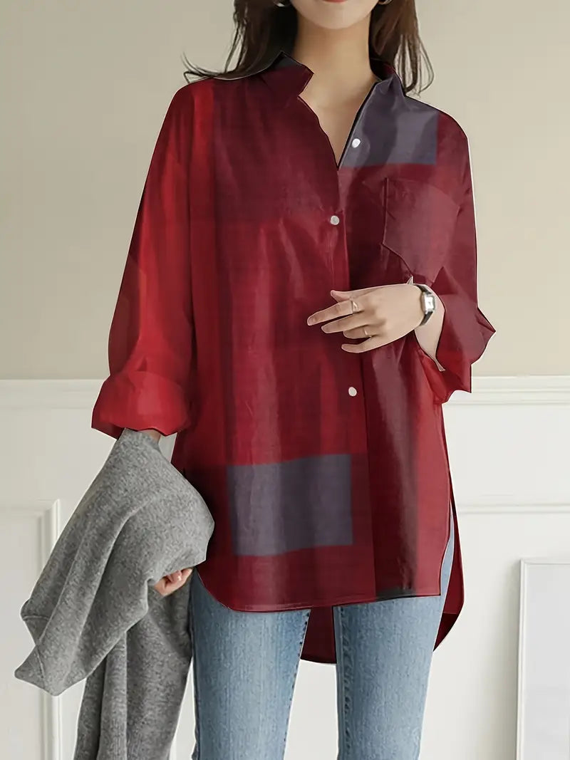 Bluzka w kratkę z długim rękawem, zapinana na guziki - casual z kołnierzykiem koszulowym dla kobiet