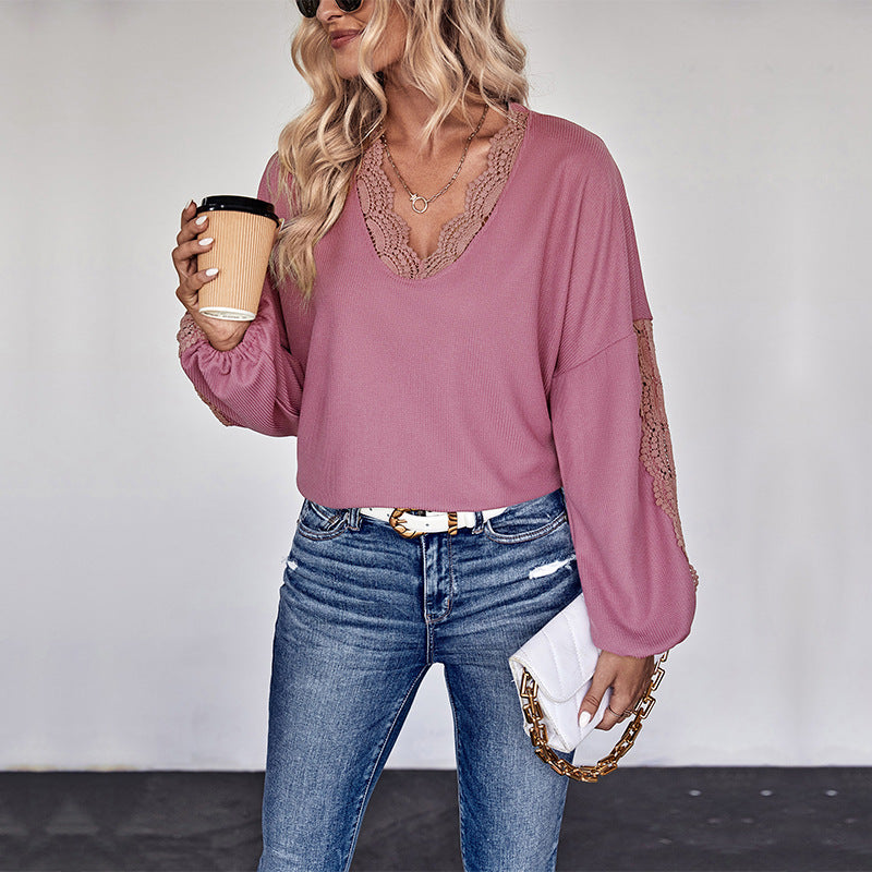Koronkowa Bluzka z Dekoltem w Serek i Długim Rękawem | Idealna na Jesień i Zimę