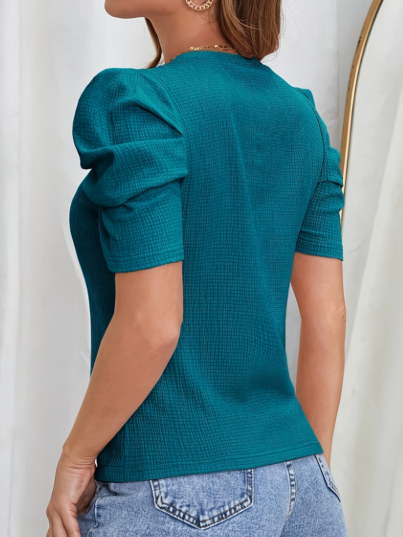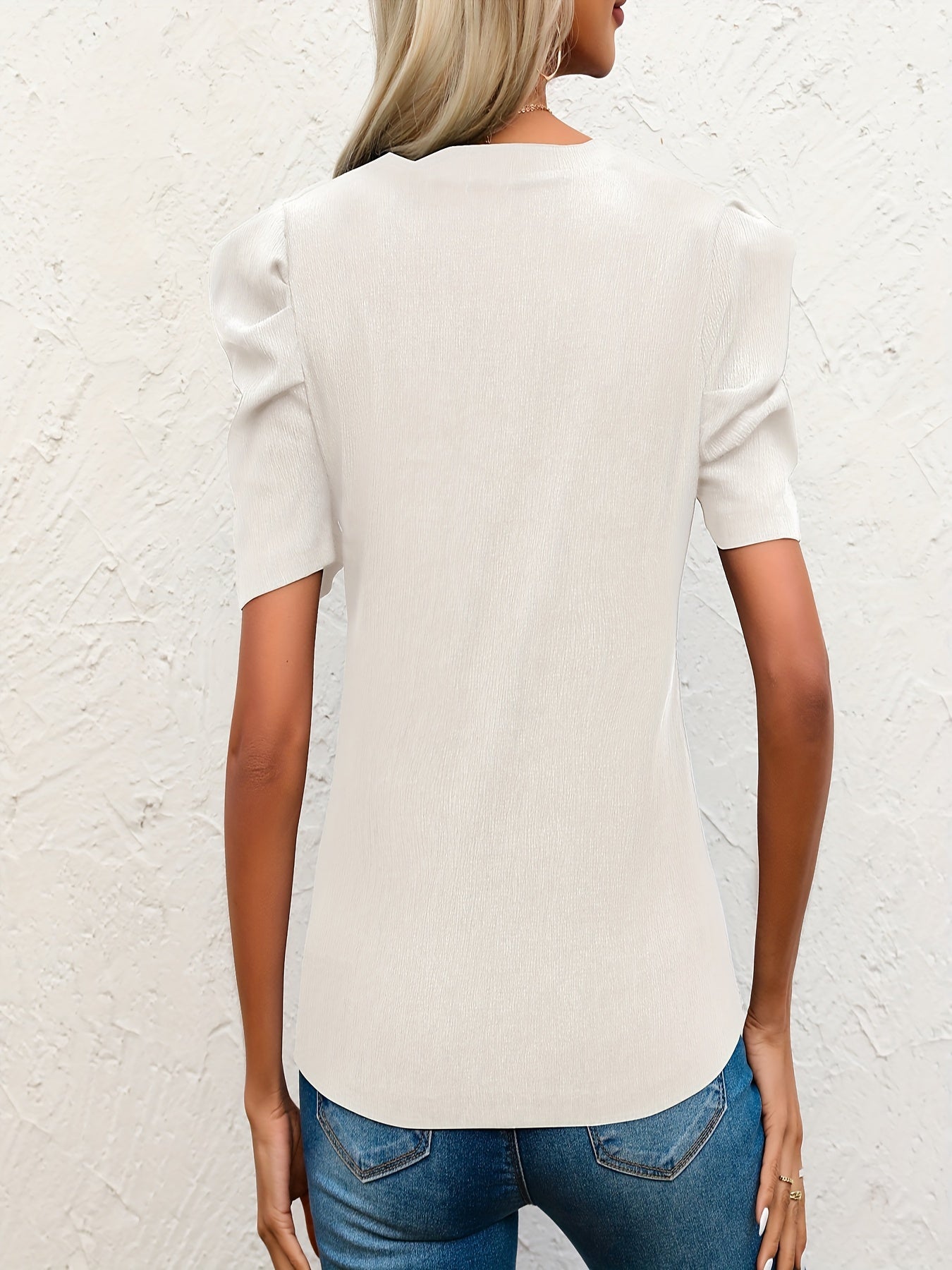 T-shirt z bufiastymi rękawami - swobodny top z okrągłym dekoltem, letnia bluzka