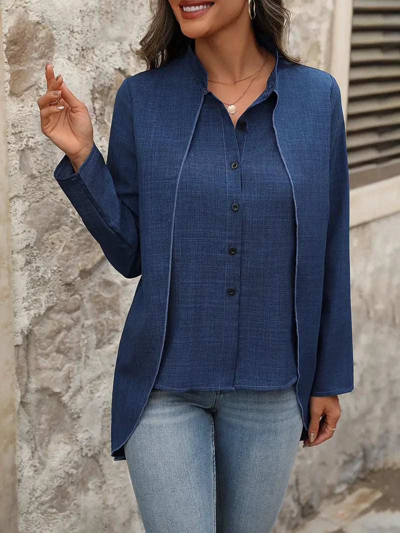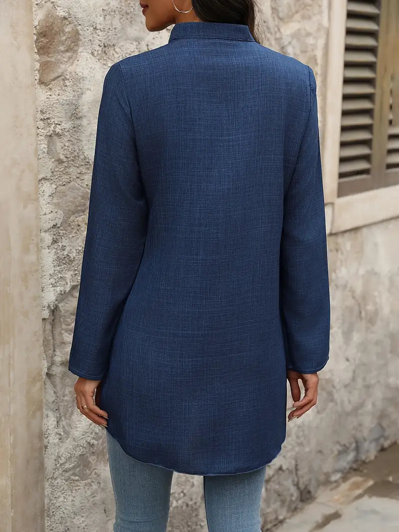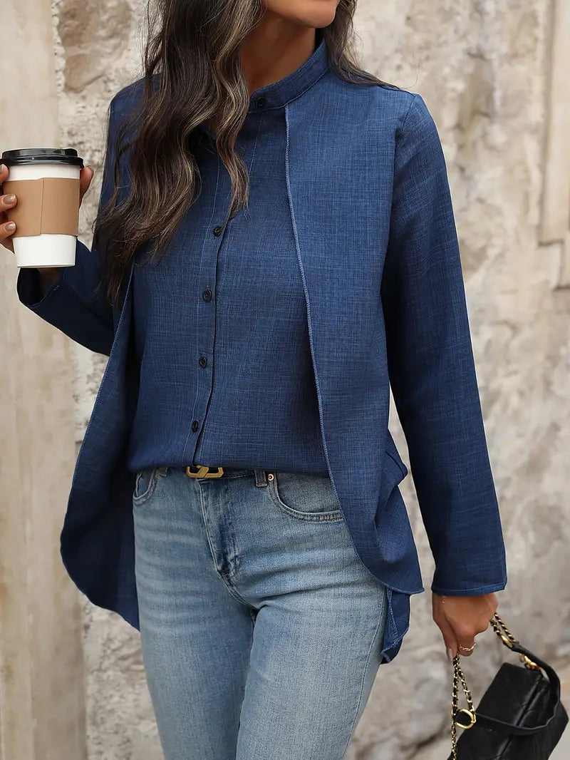 Tytuł i opis zawierają odpowiednie słowa kluczowe, takie jak „button front”, „layered blouse”, „long sleeve blouse”, „navy blue” i „casual”, aby poprawić widoczność w Google Ads i wyszukiwarkach.