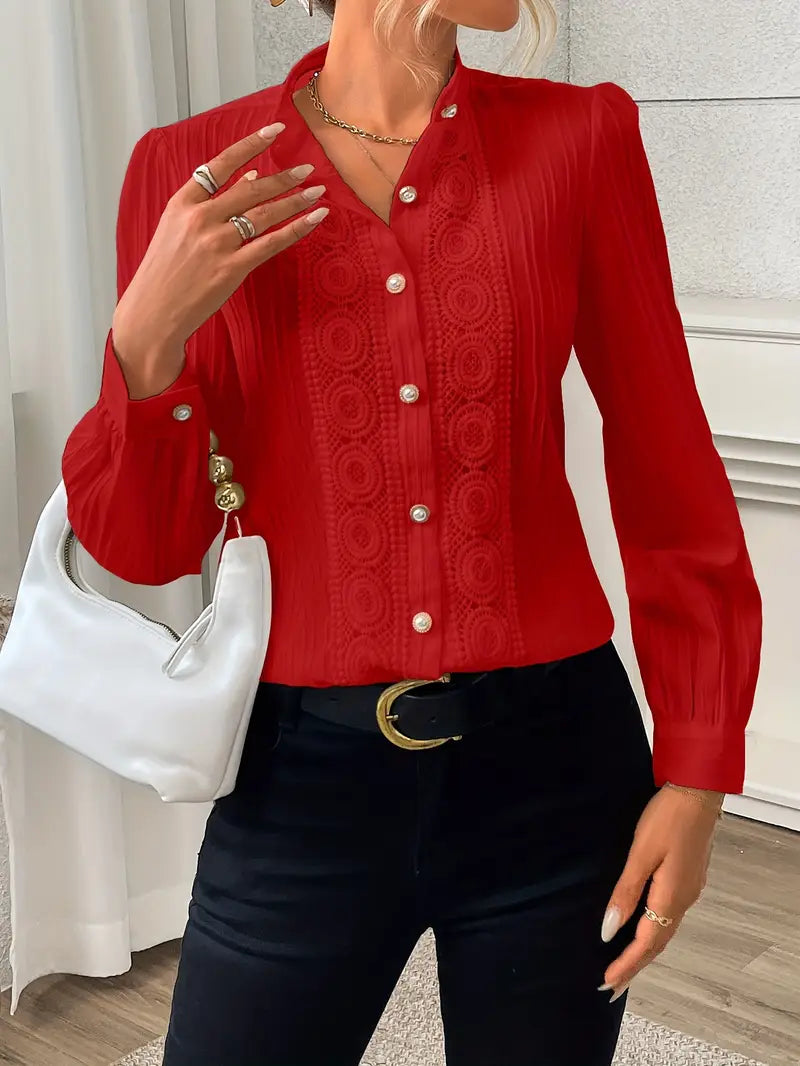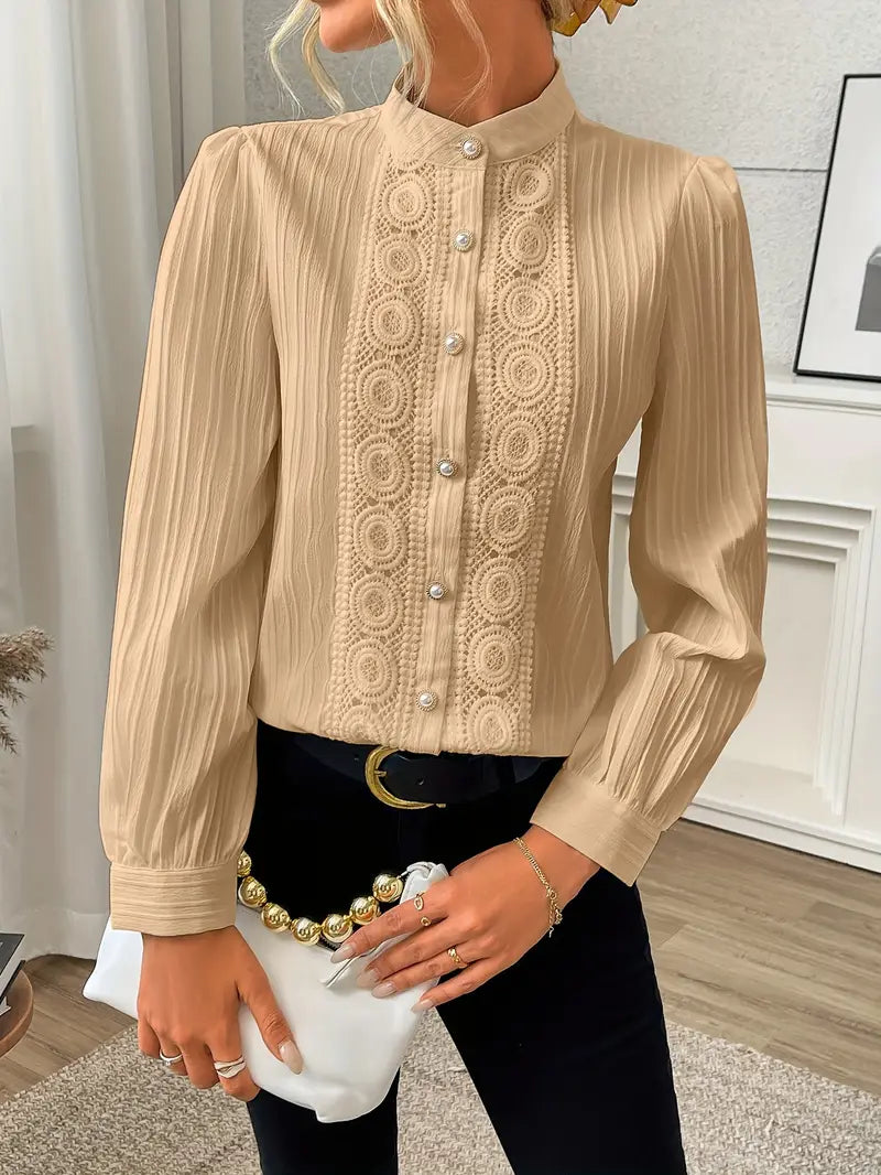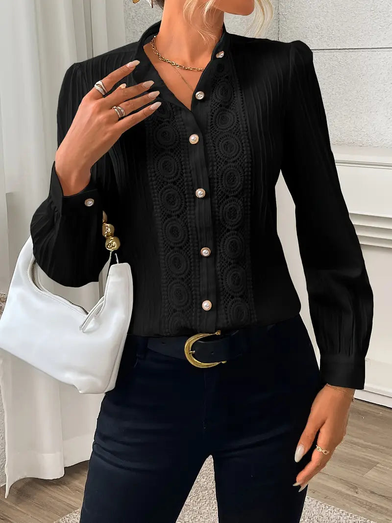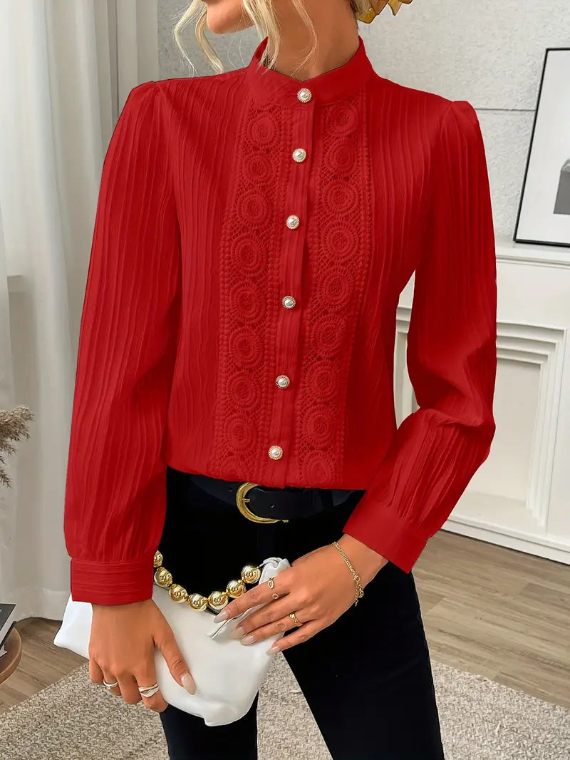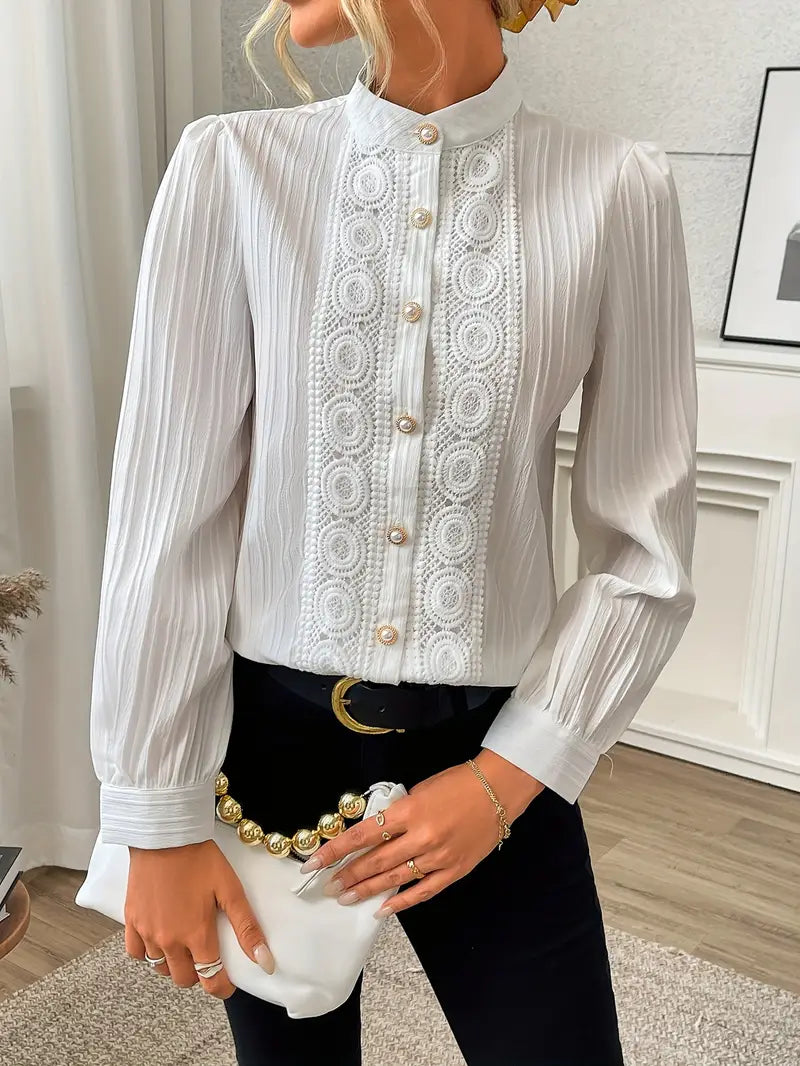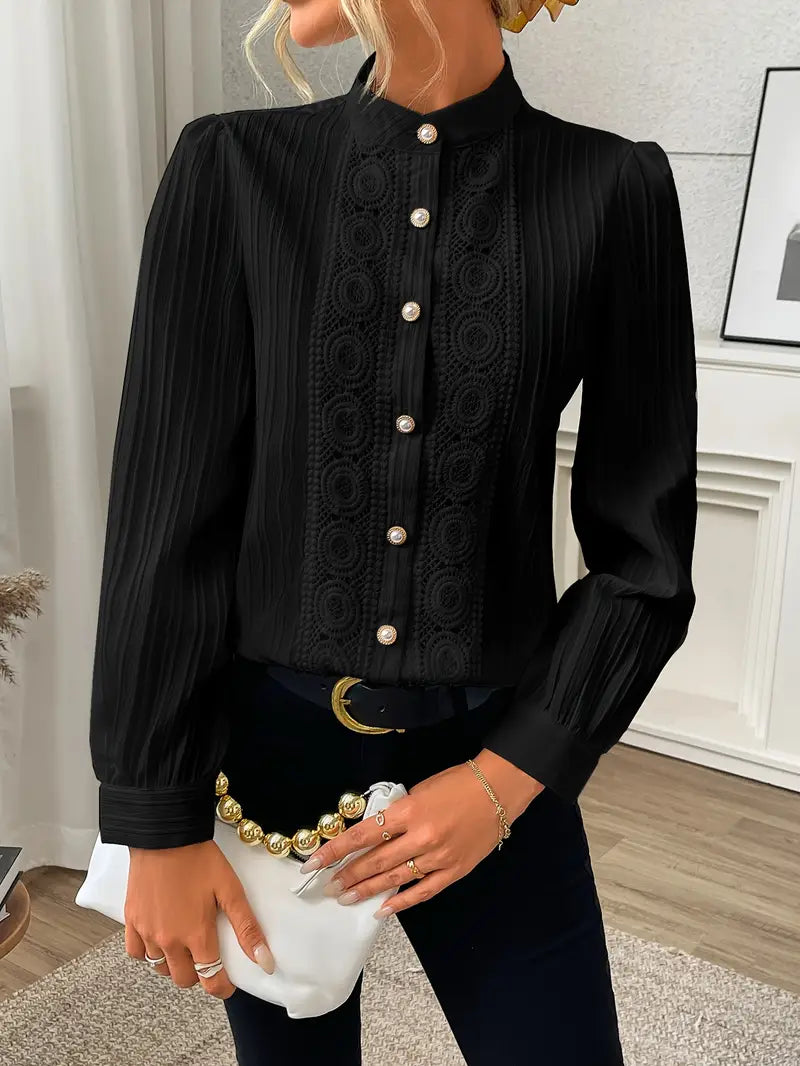 Bluzka z długim rękawem i koronką - Jednokolorowa, Teksturowana, Zapięcie na guziki