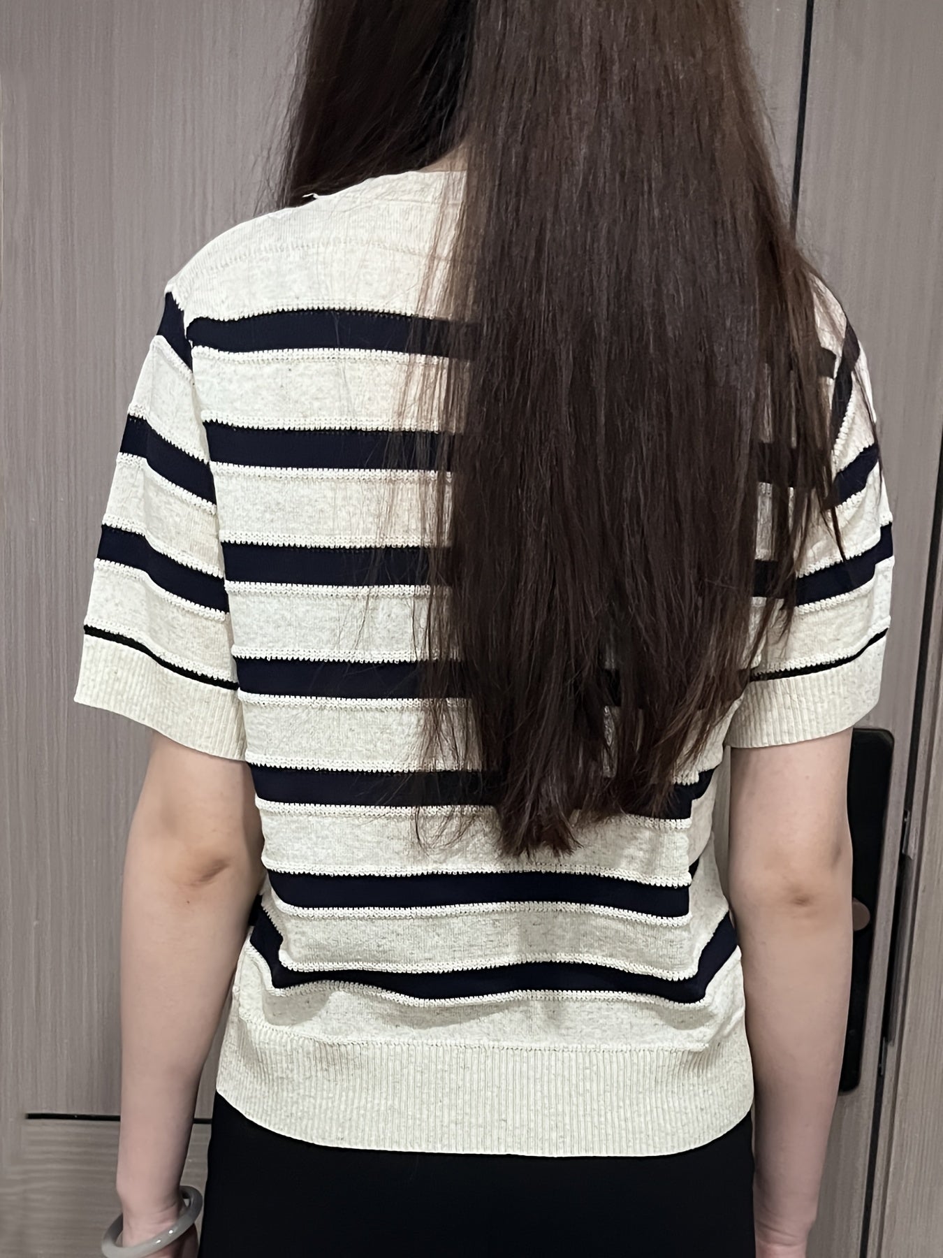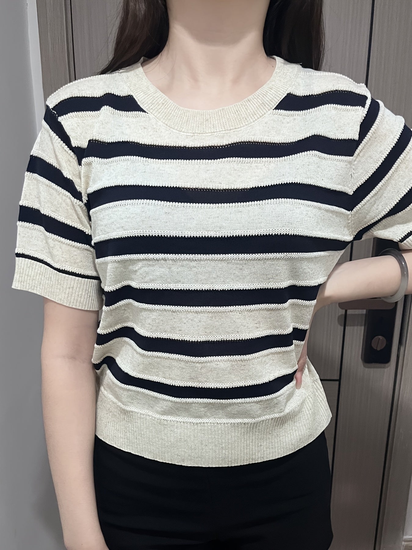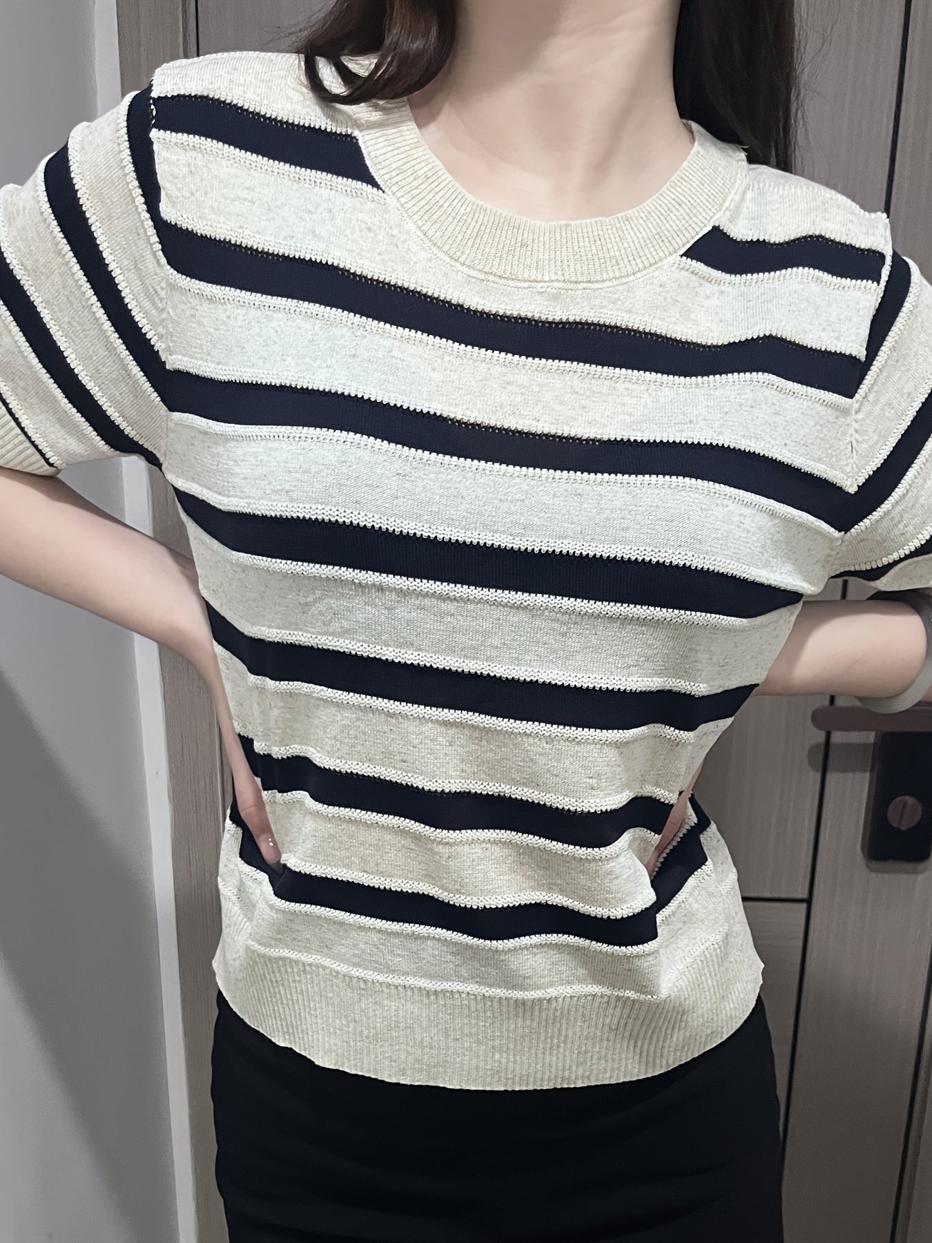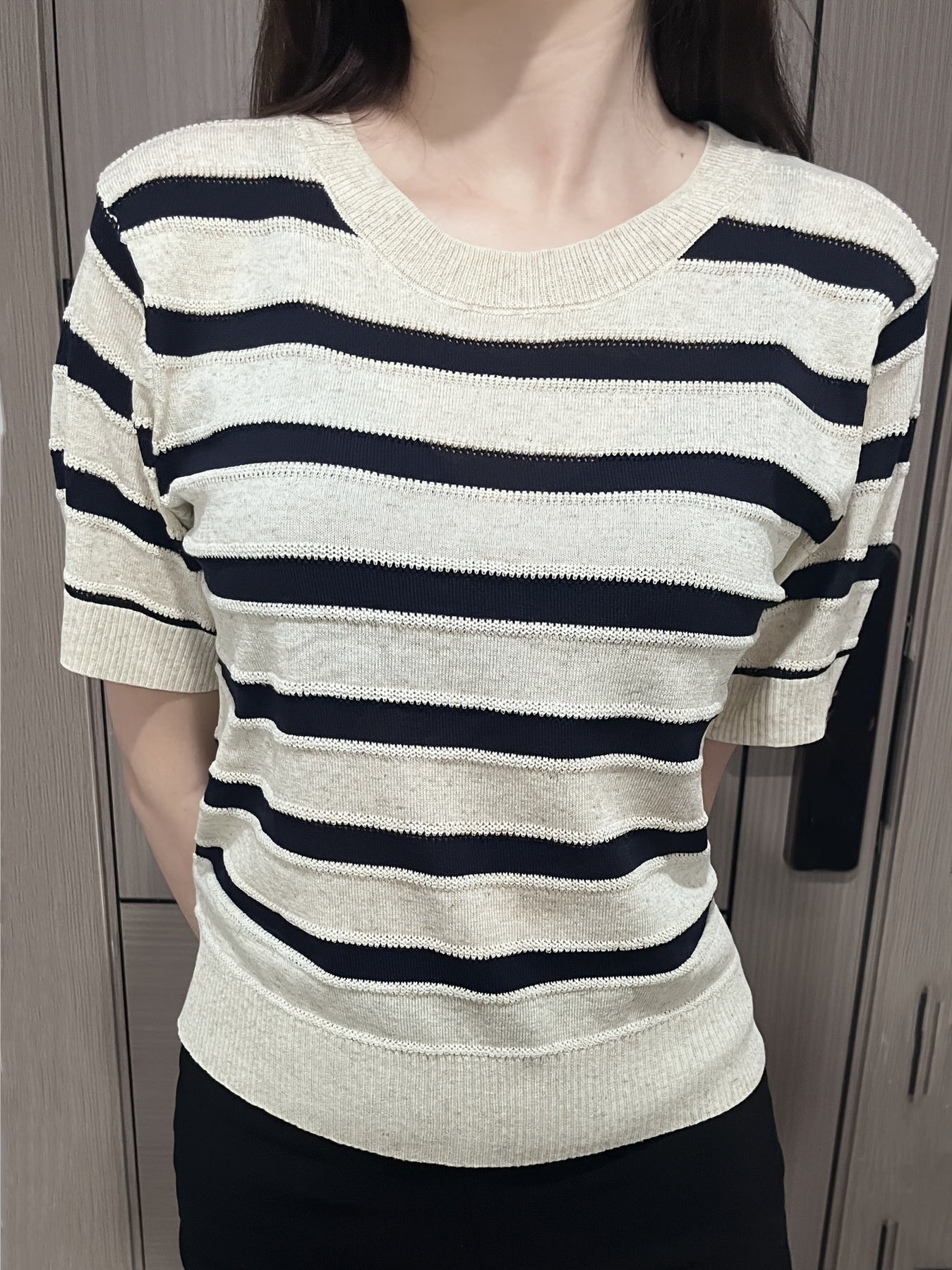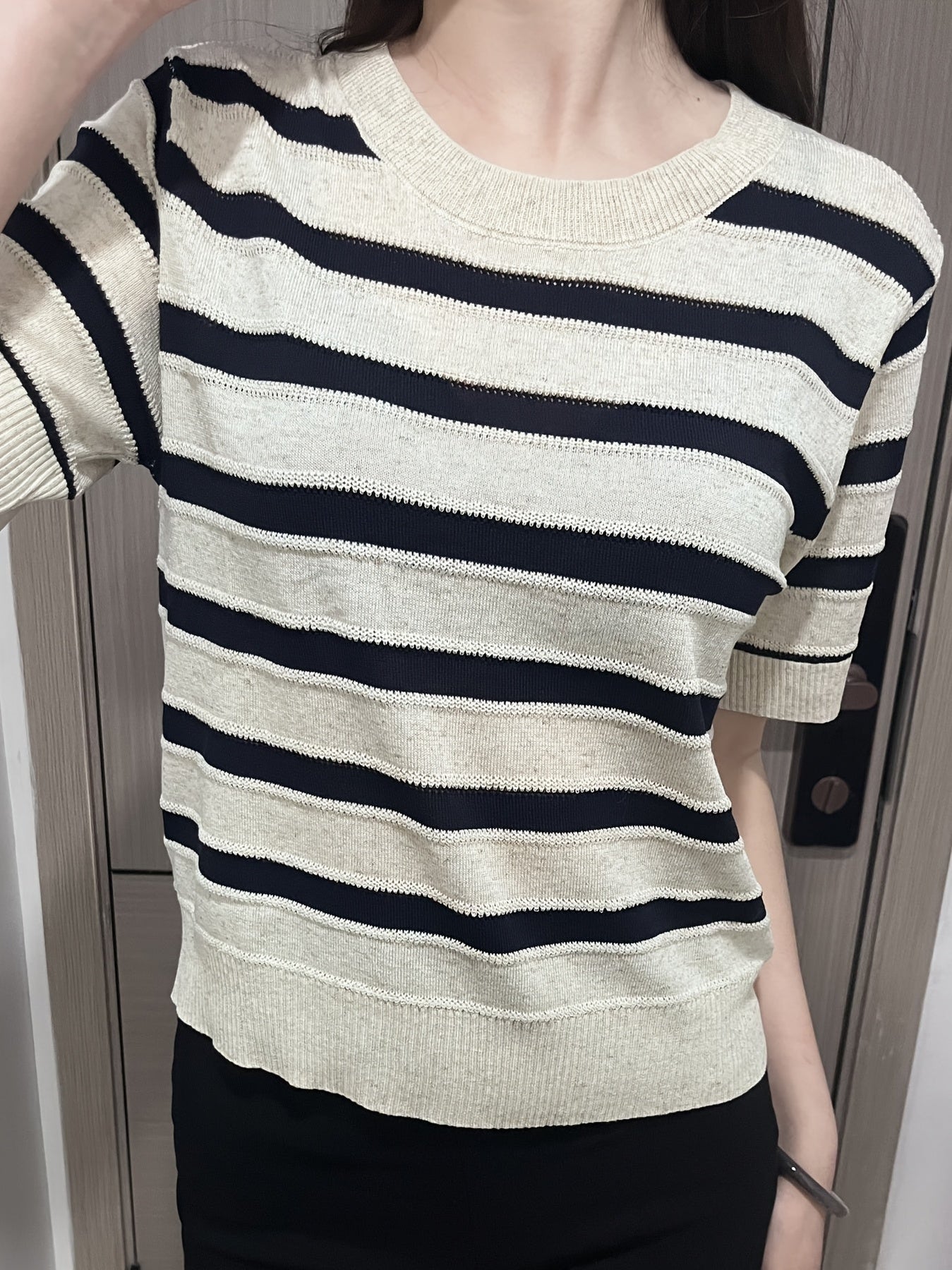 Lekka damska koszula lniana - krótki rękaw, w paski; Oddychająca