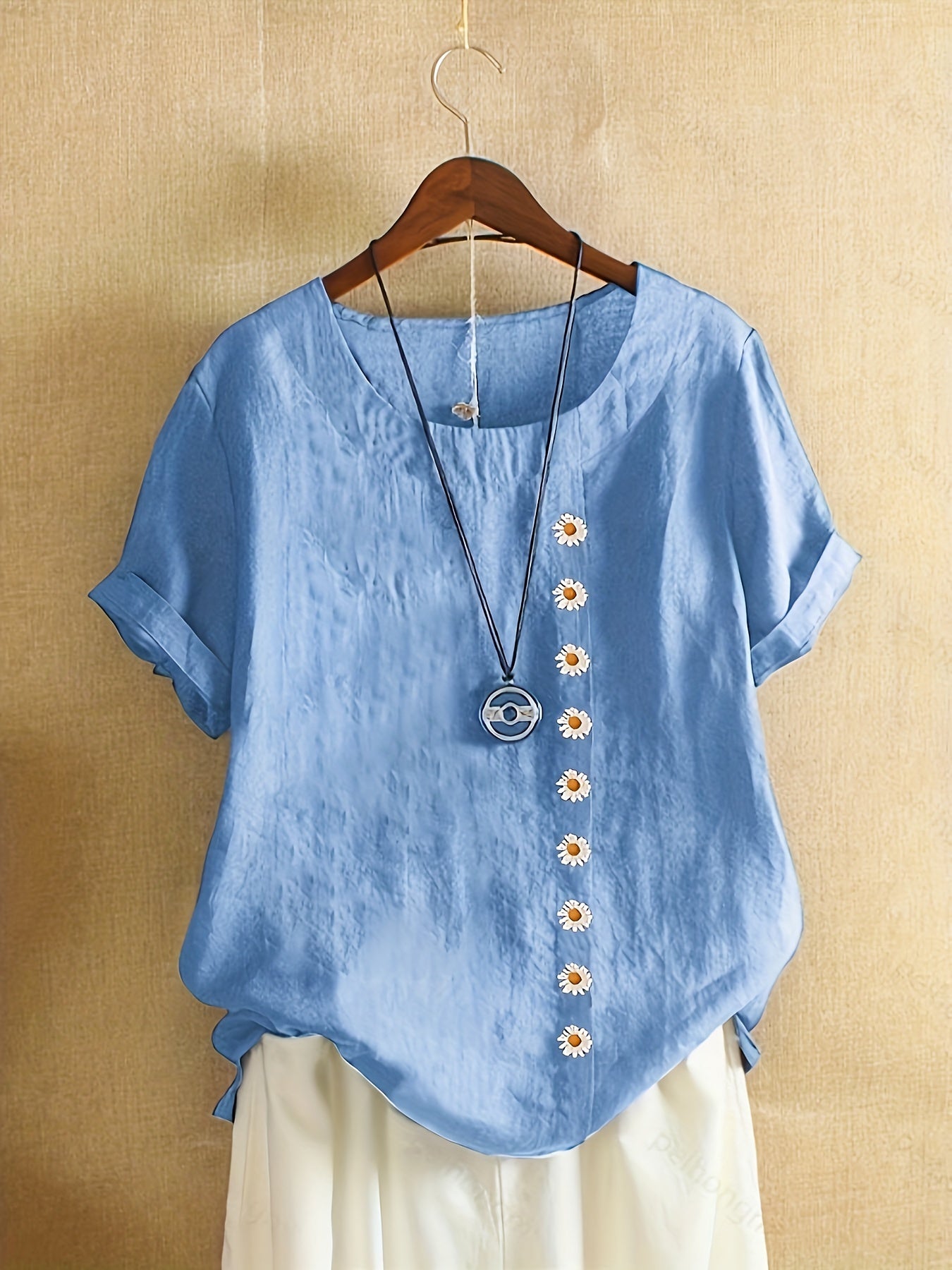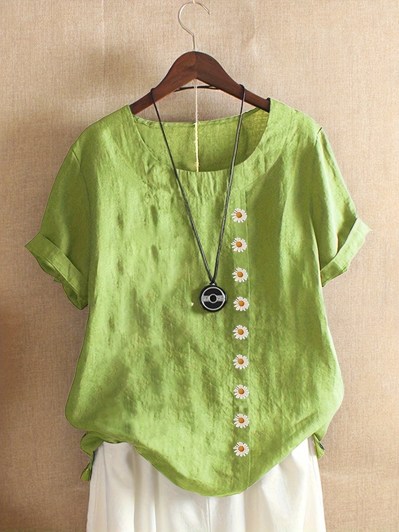 Damska lniana bluzka Plus Size – swobodna koszula pulowerowa z krótkim rękawem i nadrukiem