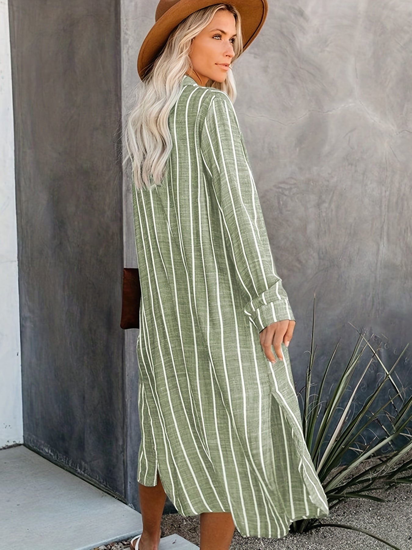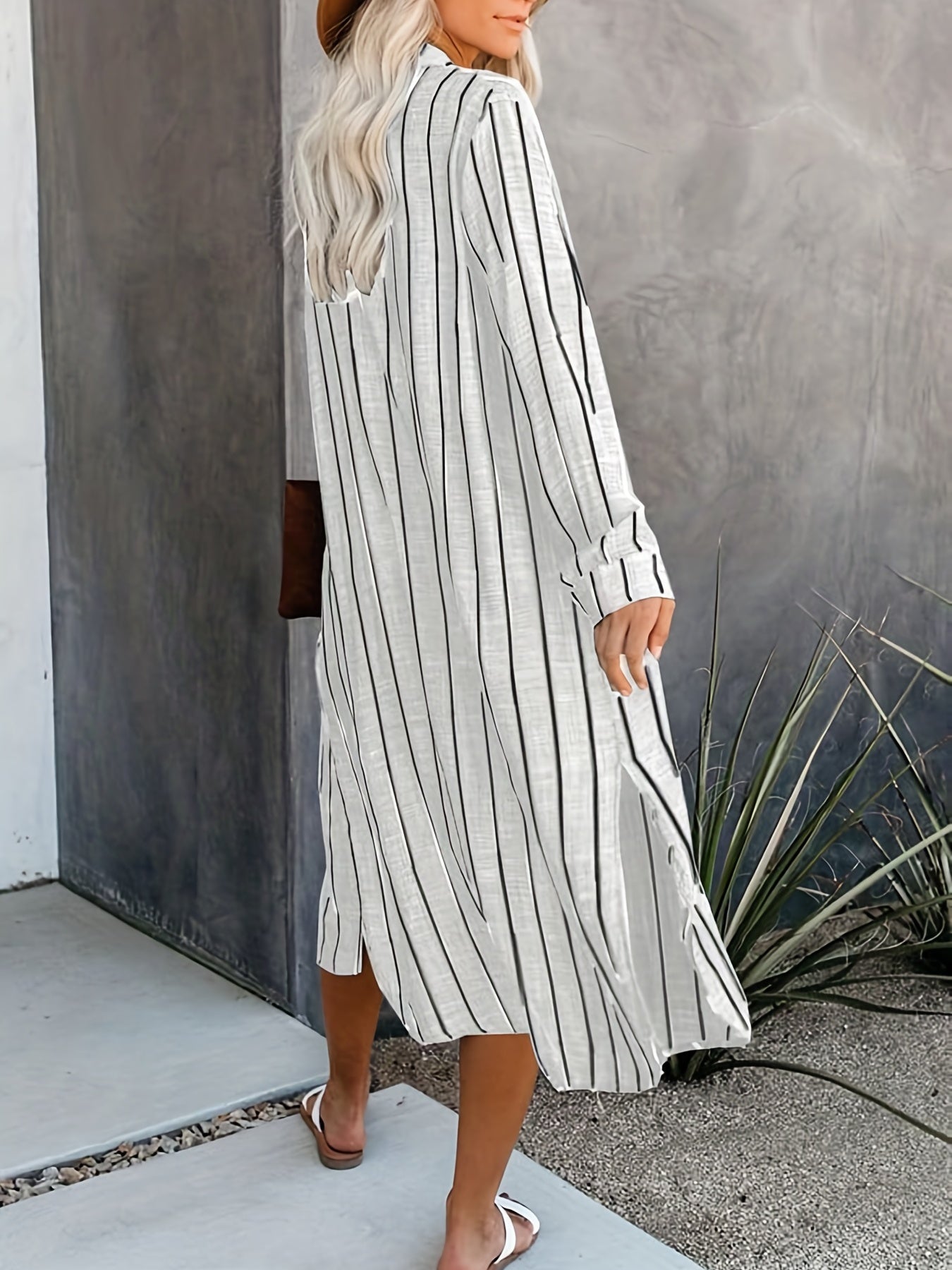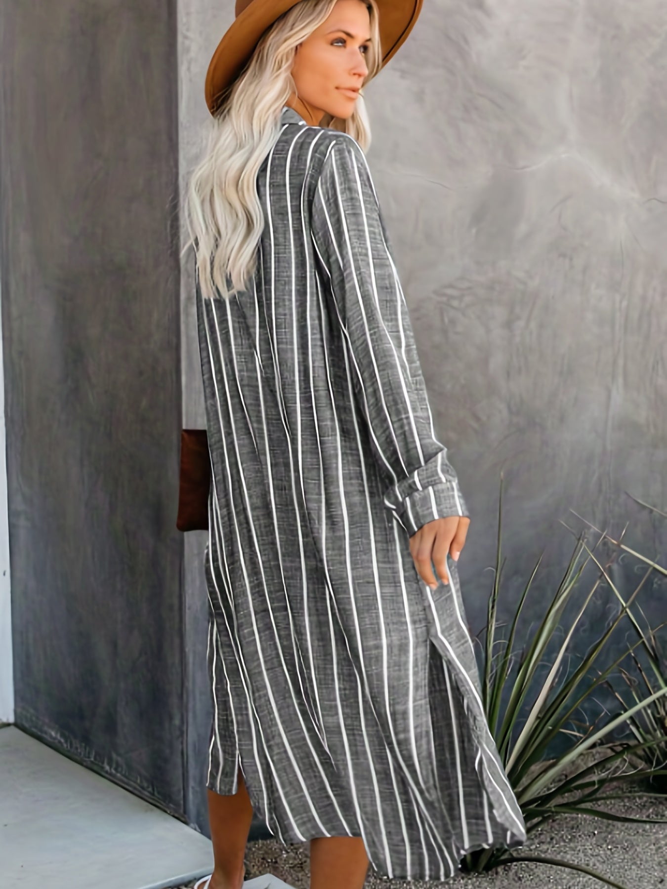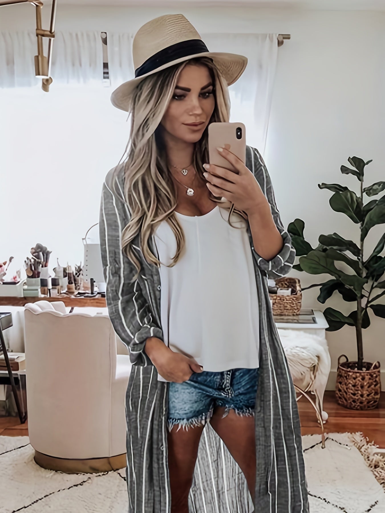Ta stylowa lniana bluzka w paski to idealny wybór na elegancki i przewiewny letni look! Wykonana z wysokiej jakości poliestru, zapewnia wygodę i przewiewność. Luźny krój, klasyczny kołnierzyk i zapięcie na guziki na całej długości sprawiają, że jest to uniwersalny element garderoby, który można nosić zarówno swobodnie, jak i elegancko. Długie rękawy można łatwo podwinąć, co jest idealnym rozwiązaniem na ciepłe dni. Dostępna w [jednym] kolorze, doskonale komponuje się z jeansami, spódnicami lub lekkimi letnimi spodniami.