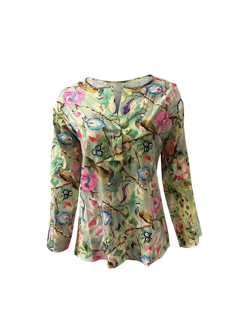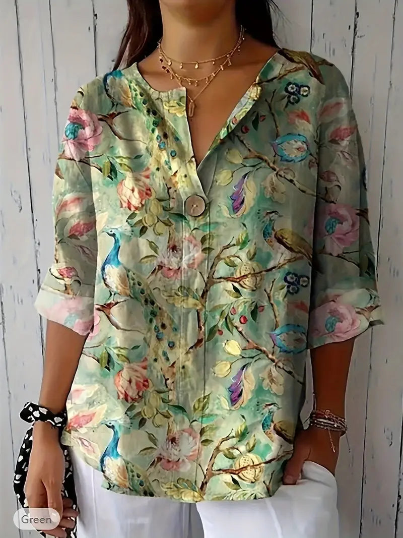 Ta casualowa bluzka w delikatnym kolorze matcha doda elegancji każdej codziennej stylizacji. Nadruk w kwiaty i pawie sprawia, że bluzka przyciąga wzrok, a karbowany kołnierzyk nadaje jej nowoczesny, stylowy wygląd.