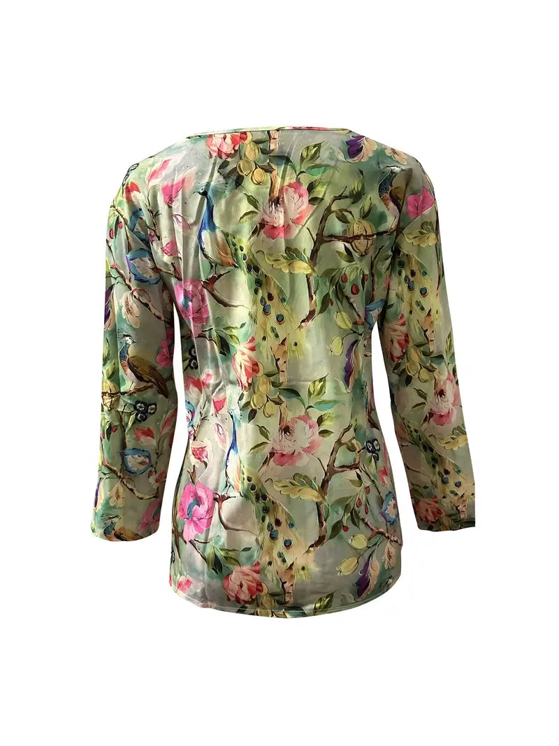 Bluzka matcha z kwiatowym nadrukiem w pawie, kołnierzyk z wycięciem