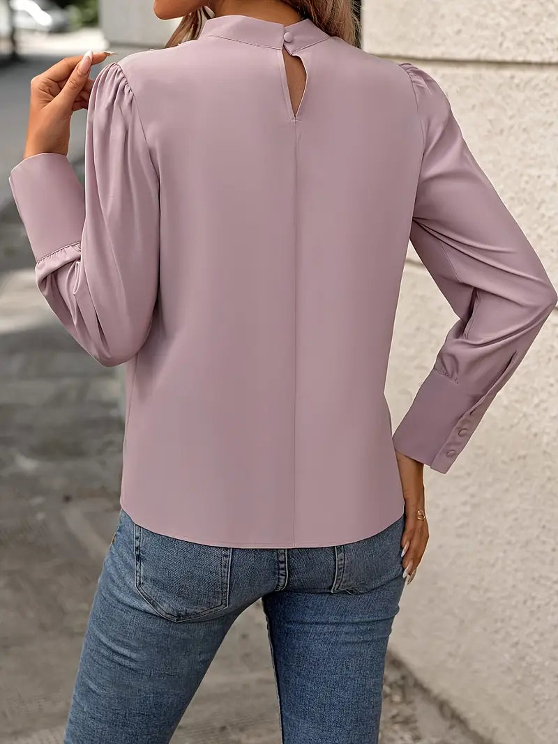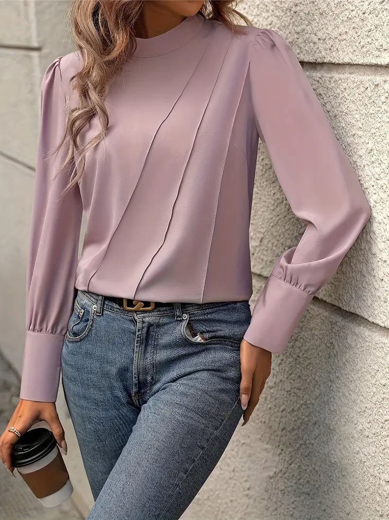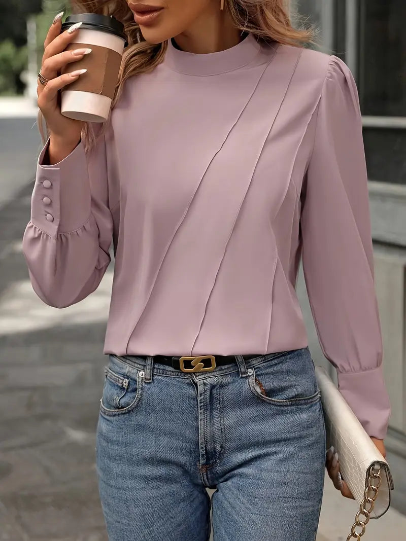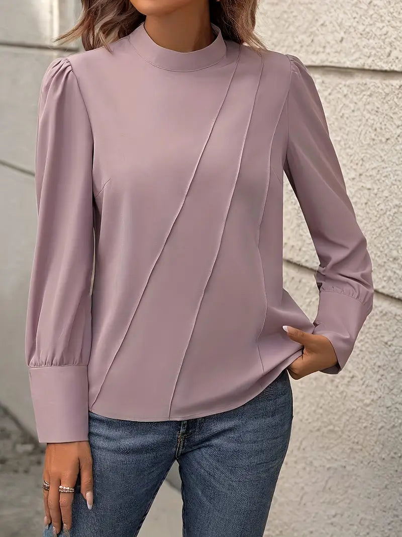 Ta stylowa bluzka typu mock-neck z eleganckimi przeszyciami to idealny wybór na jesień i zimę. Wykonana z wysokiej jakości poliestru w delikatnym liliowym kolorze, oferuje kobiecy wygląd, który zachwyci zarówno w biurze, jak i w czasie wolnym. Bluzka z długim rękawem łączy wygodę z modnym szykiem i jest idealna dla Niemek ceniących styl i uniwersalność.