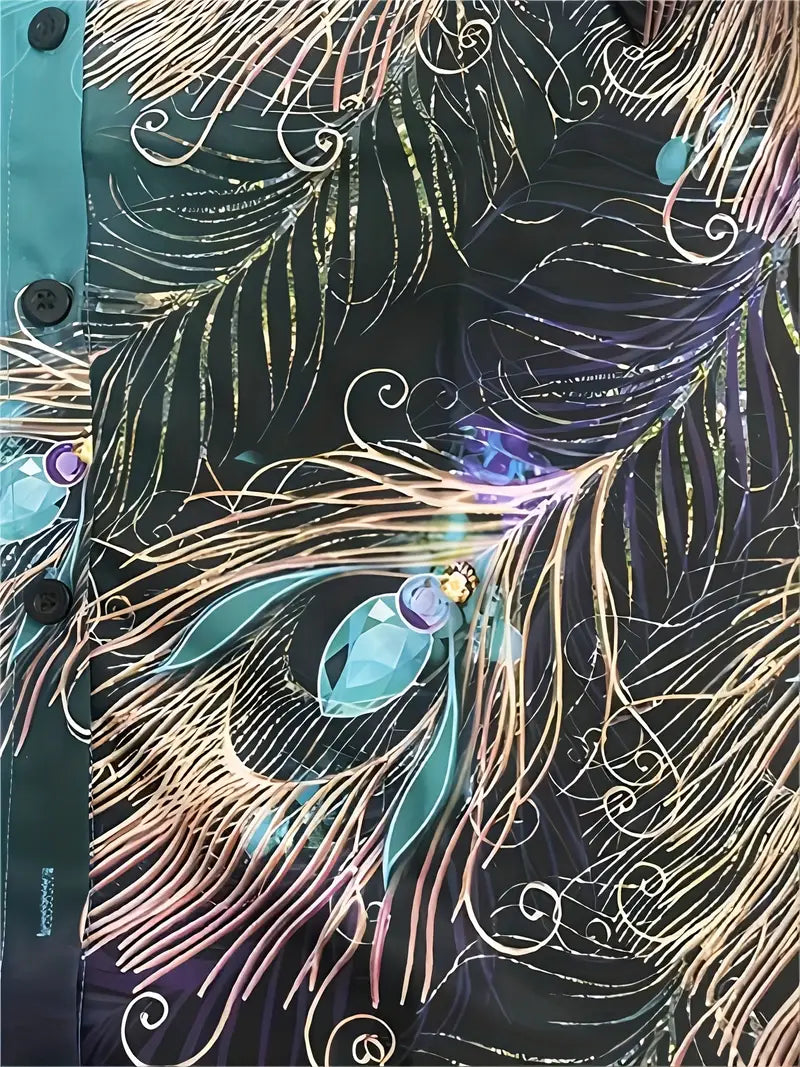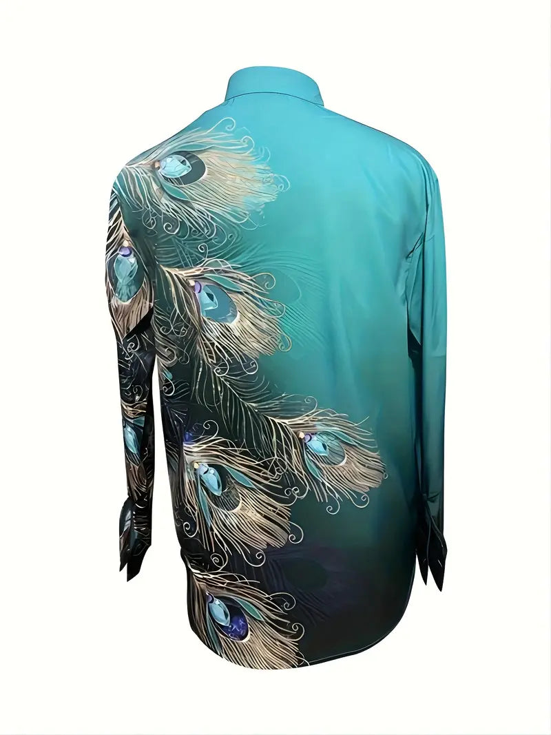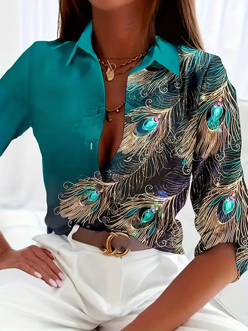 Damska koszula z długim rękawem z nadrukiem w pawie pióra, zapinana na guziki