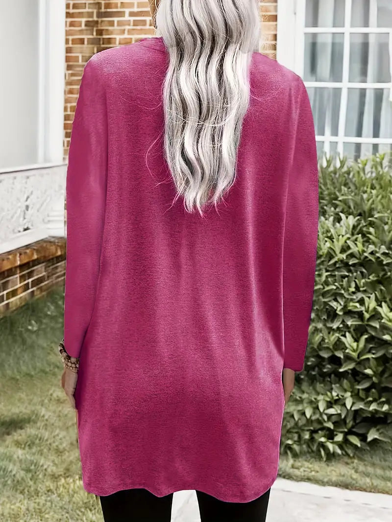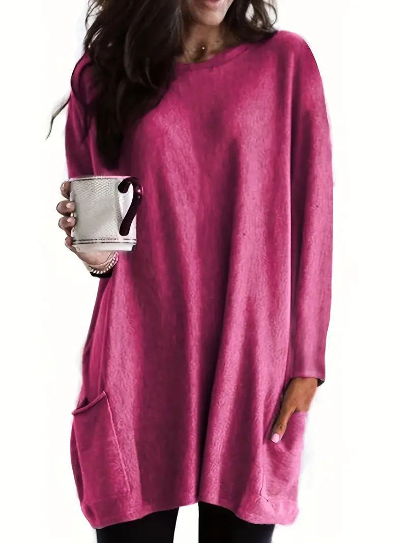 Nasz t-shirt w rozmiarze plus size to uniwersalny dodatek do Twojej garderoby. Ta koszula w stylu tuniki ma długie rękawy, okrągły dekolt i praktyczne kieszenie zwiększające funkcjonalność. Wykonany jest z wysokiej jakości materiału o średniej rozciągliwości, który zapewnia wygodę i styl. Idealny do noszenia na co dzień, niezależnie od tego, czy załatwiasz sprawy, czy odpoczywasz w domu. Zachowaj wygodę i szyk dzięki temu niezbędnemu elementowi garderoby dla kobiet w dużych rozmiarach.