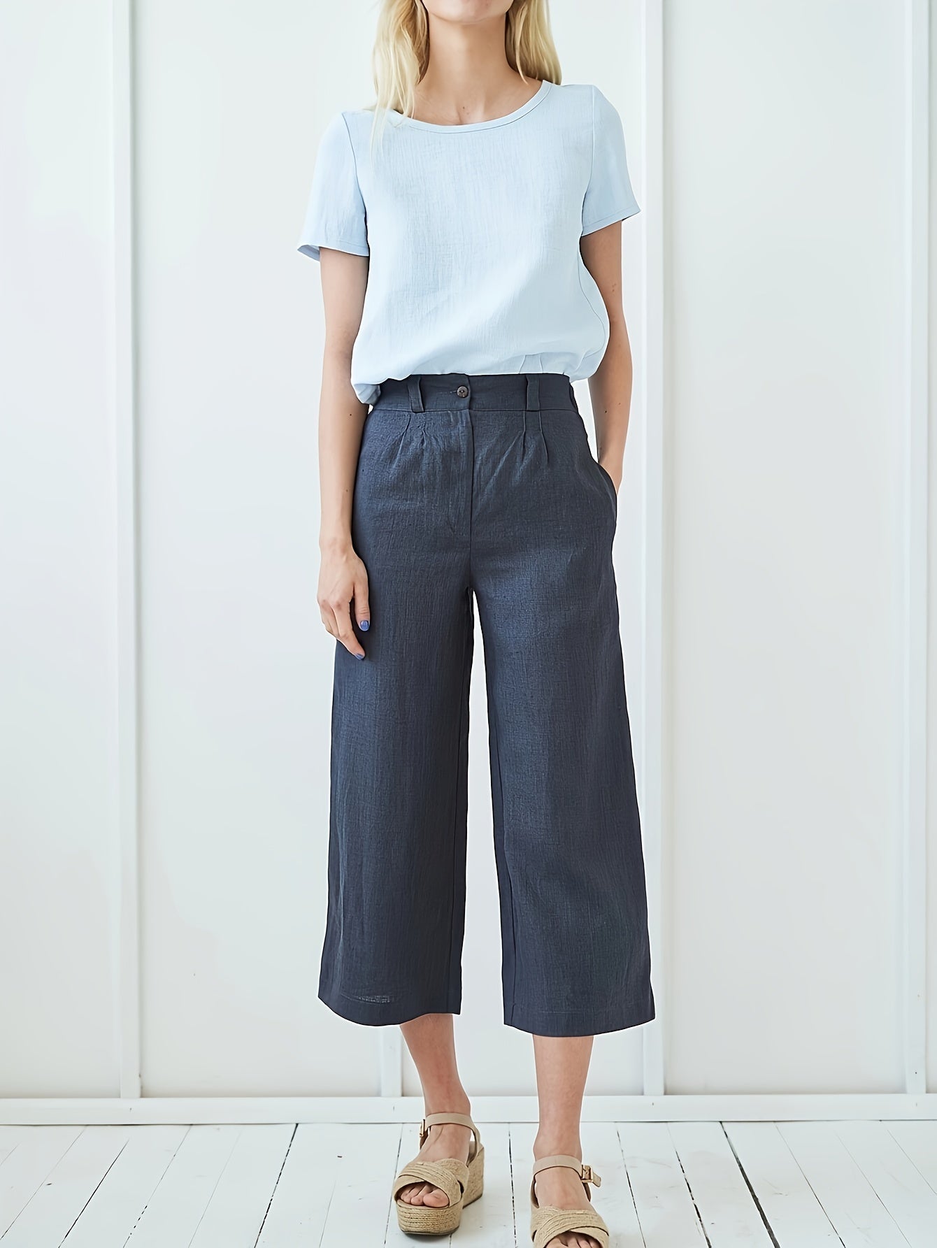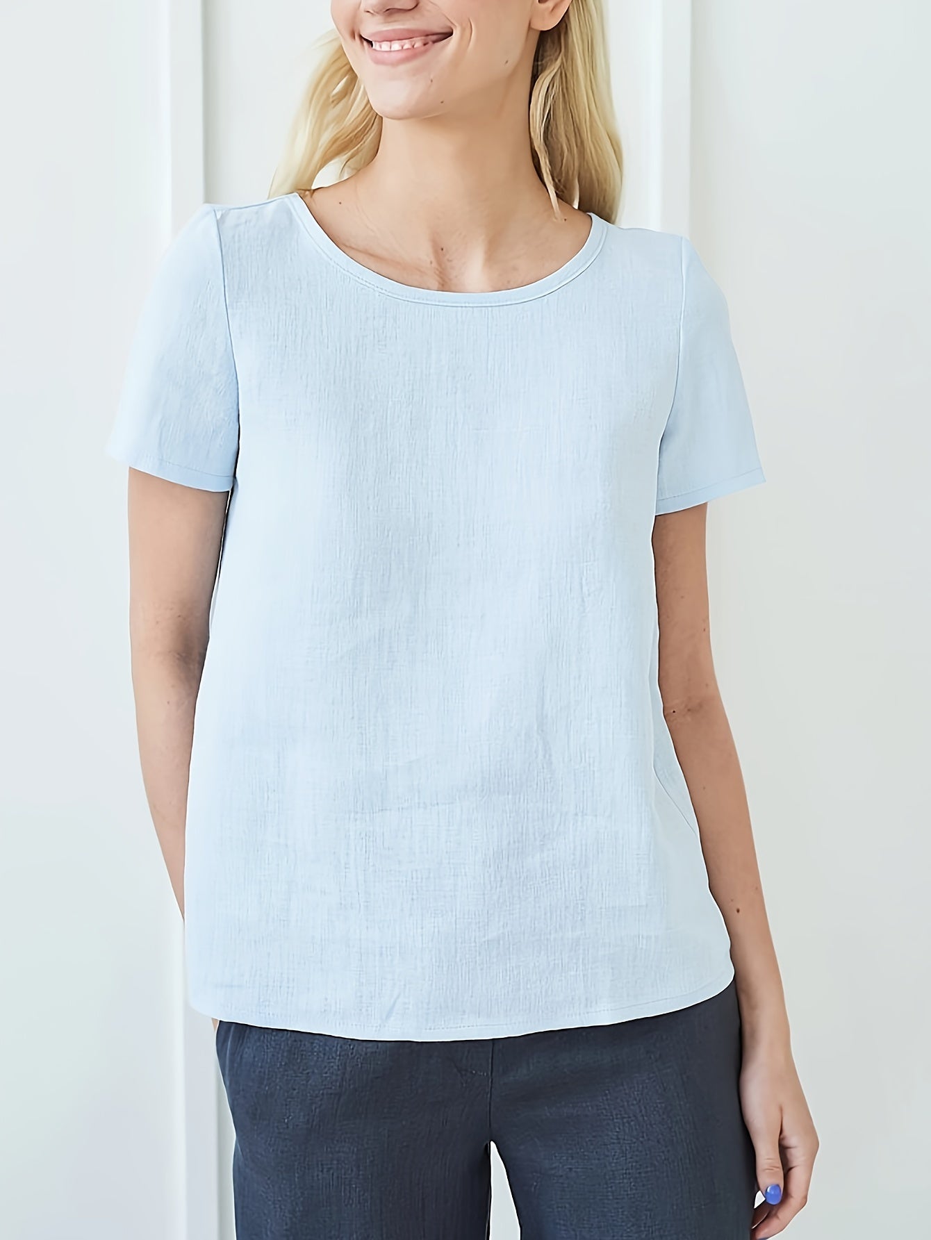 Swobodna krótka bluzka dla kobiet - zaangażowane detale, okrągły dekolt, lato i wiosna