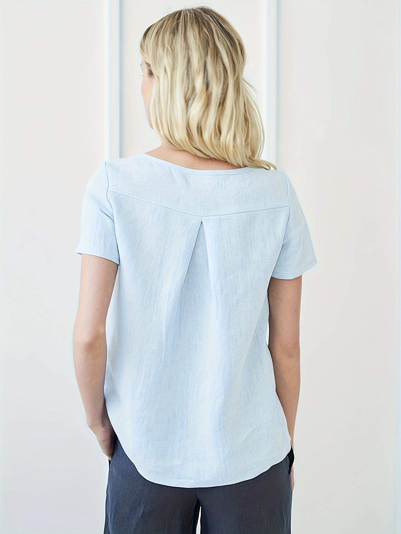 Ta swobodna bluzka z krótkim rękawem dla kobiet jest idealnym codziennym towarzyszem na wiosnę i lato. Skomplikowane szczegóły z przodu i okrągłego dekoltu nadają bluzce elegancki dotyk, a luźne dopasowanie zapewnia najwyższy komfort. Wykonany z lekkiego, oddychającego materiału, zapewnia mu przyjemność nawet w upalne dni. Idealny do zrelaksowanego wyglądu, który można idealnie połączyć z dżinsami lub szortami.