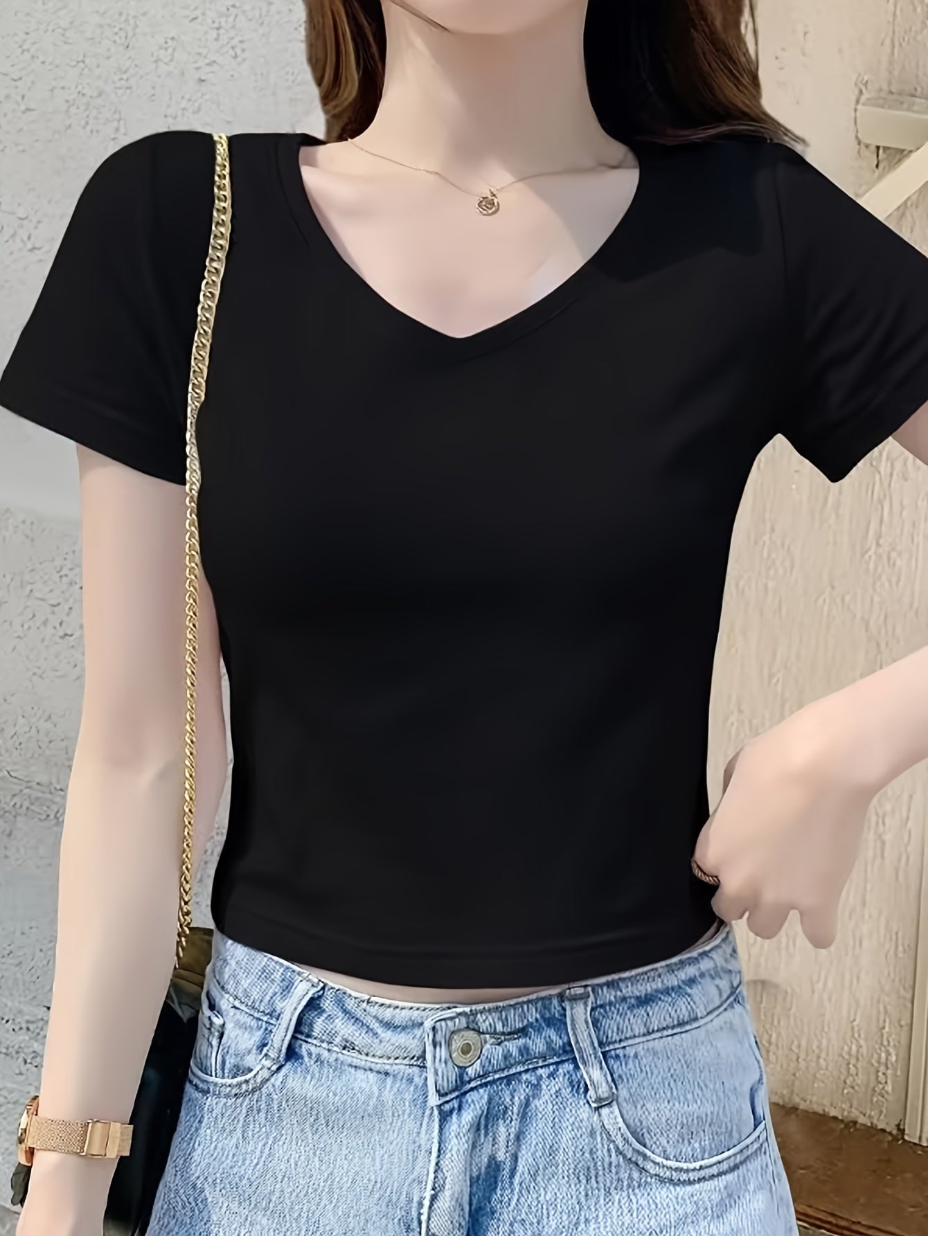 Ciesz się latem w tej oddychającej damskiej koszulce z eleganckim dekoltem w kształcie litery V. Lekki materiał zapewnia wygodę noszenia i chłód nawet w upalne dni. Luźny krój i stylowy fason sprawiają, że jest to idealny dodatek do letniej garderoby. Idealny do łączenia z szortami, dżinsami lub spódnicami, aby uzyskać swobodny i modny wygląd.