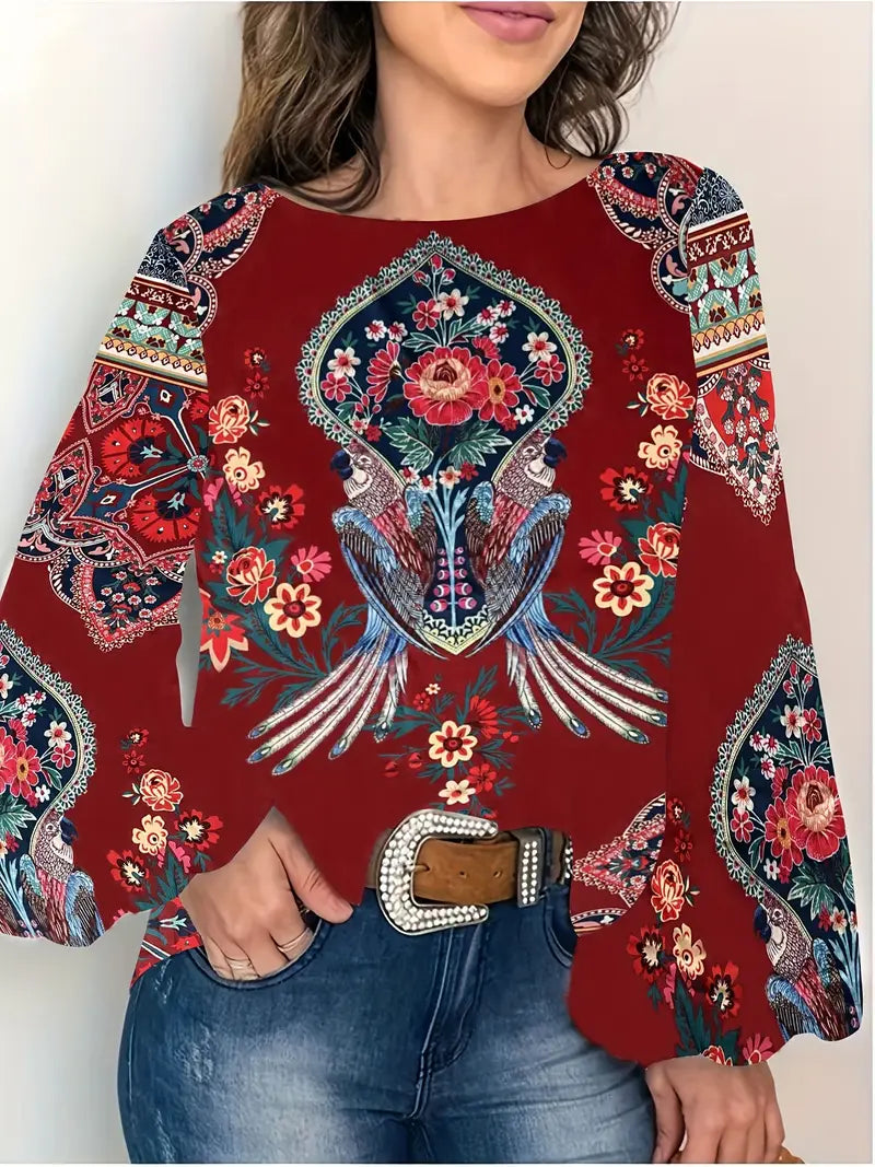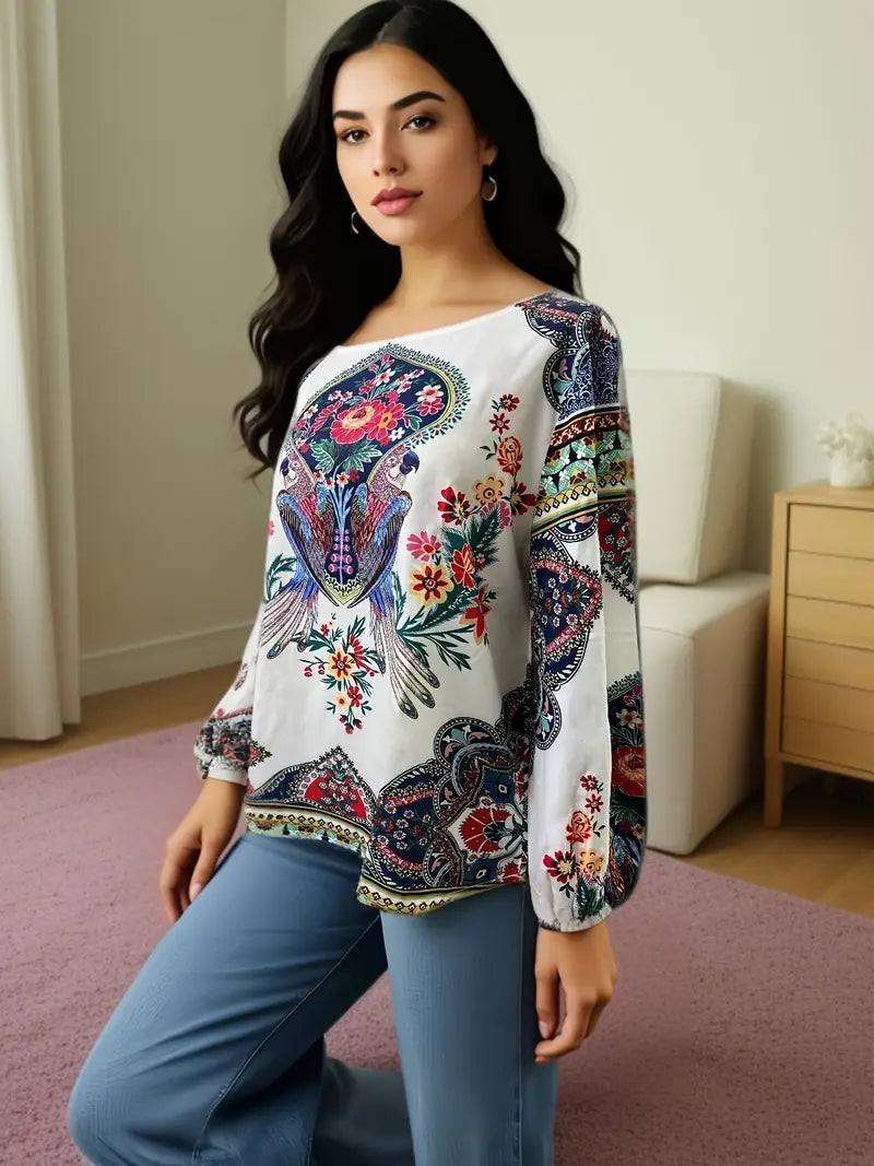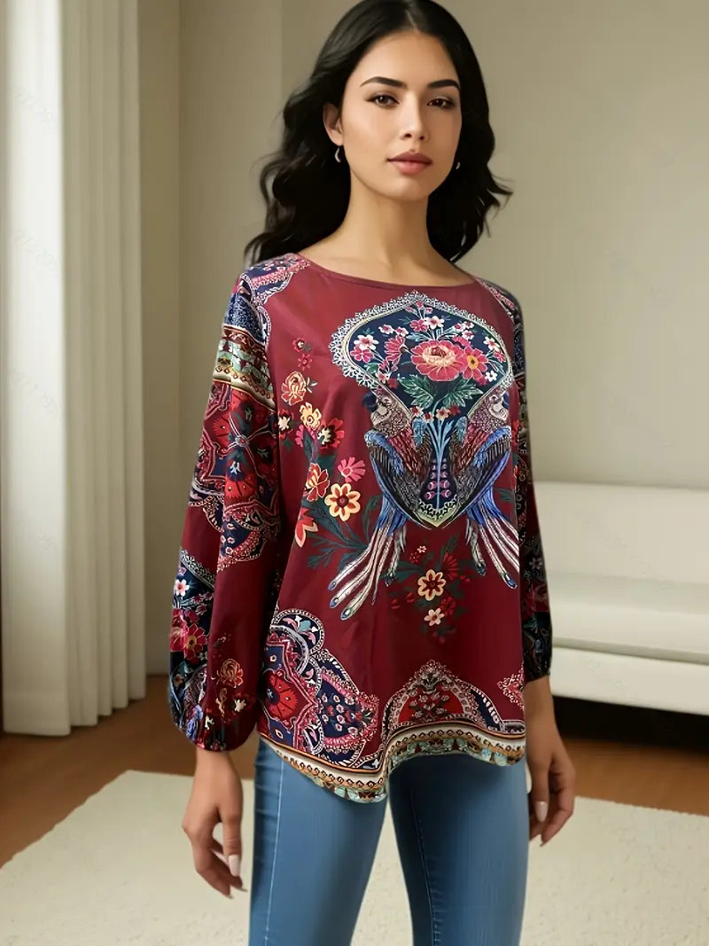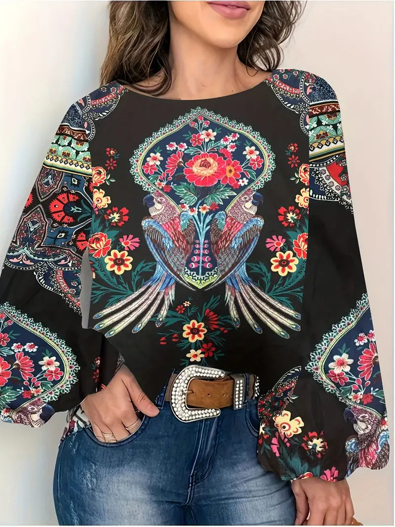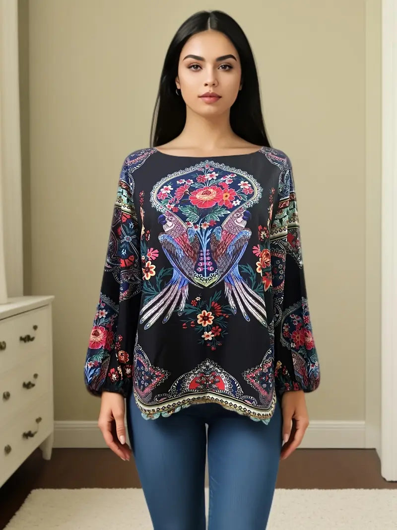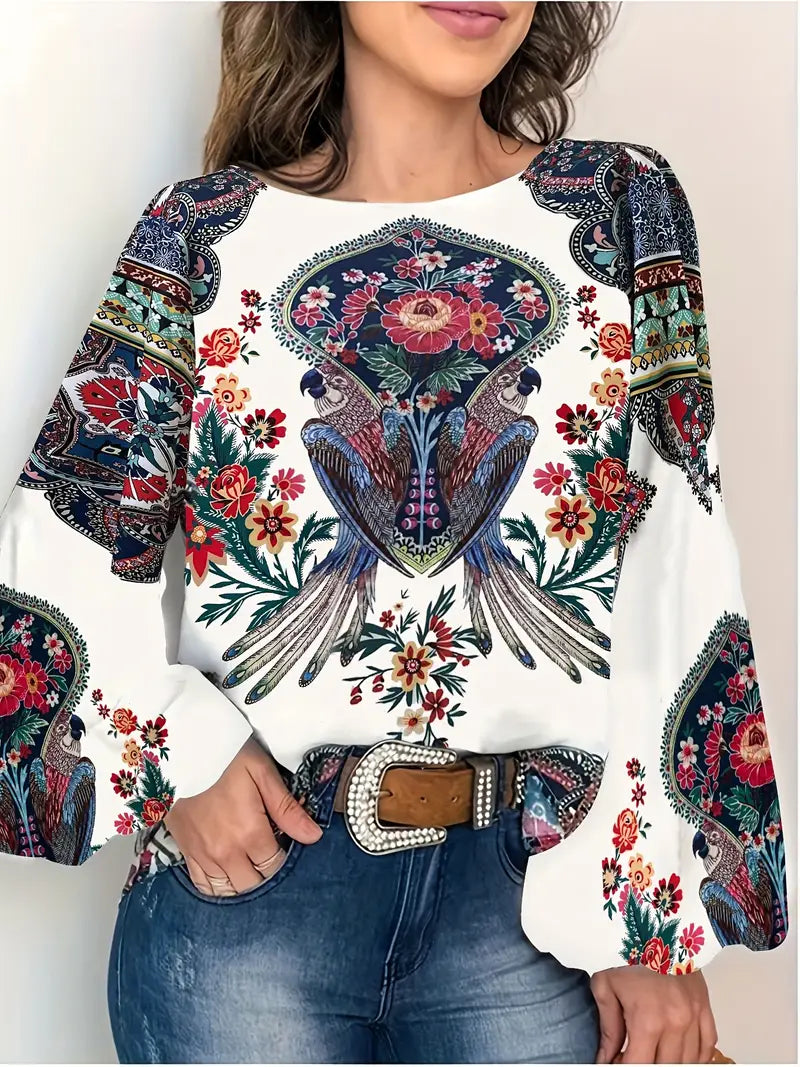 Oversizowa bluzka damska retro, długi rękaw z kwiatowym wzorem w ptaki