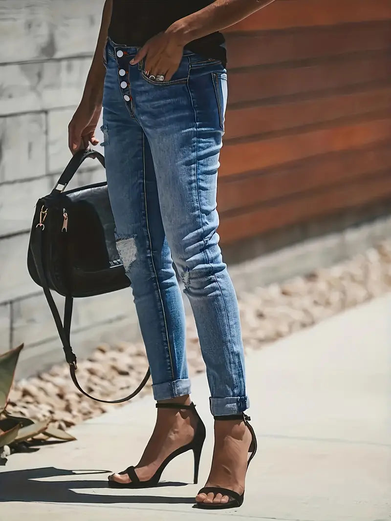 Nasze niebieskie dżinsy z dziurami i dziurami to stylowy dodatek do Twojej garderoby, który łączy modny design z wygodą. Dżinsy są wykonane z wysokiej jakości denimu i mają dopasowany krój, który podkreśla Twoje kształty, a dzięki bardzo elastycznemu materiałowi są elastyczne. Jednorzędowe zapięcie na guziki dodaje odrobinę wyrafinowania, a dziurawe dziury dodają nowoczesnego akcentu Twojemu wyglądowi. Idealne na nieformalne wyjścia lub weekendowe przygody, te dżinsy są na tyle wszechstronne, że można je połączyć z dowolną górą lub obuwiem. Dzięki naszym dżinsom Blue Ripped Holes zawsze będziesz dobrze ubrana i będziesz mieć pewność swobodnego stylu na każdym kroku.